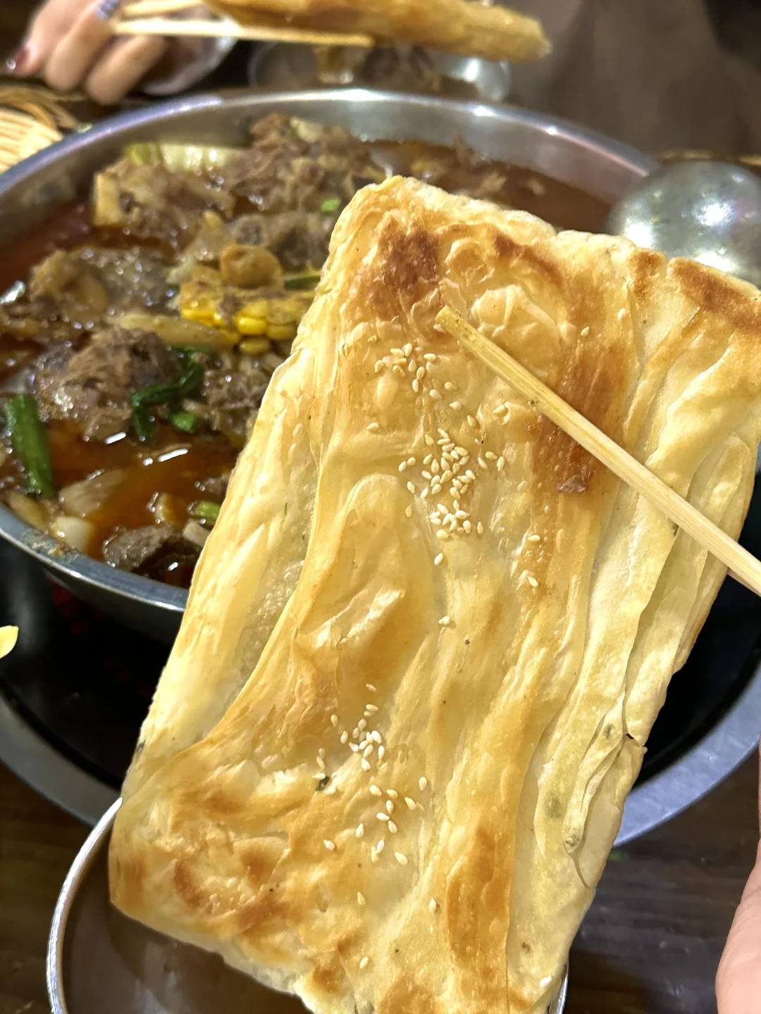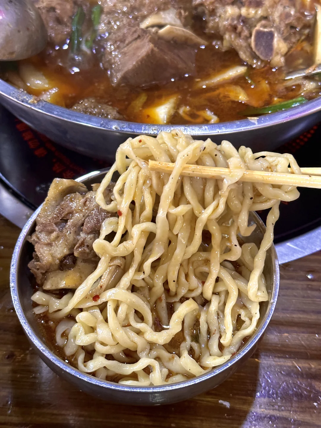 开在居民楼下的一家小店,肉都是带骨头的那种,一锅分量很大,有玉米,豆皮,白菜,可以2-3人吃!!他家是手工面很劲道