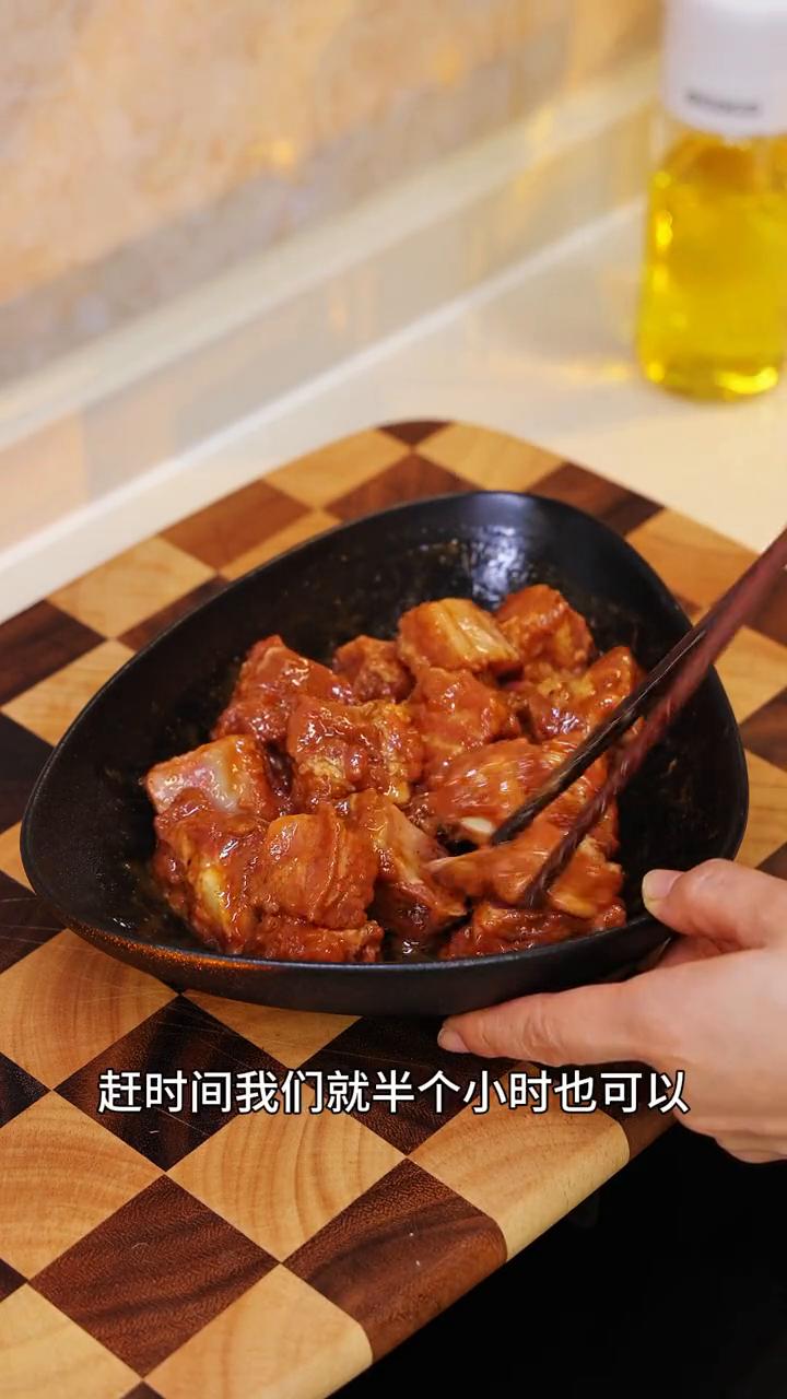 真的一滴水都不用加,这样做出来的排骨刚好脱骨,又香又入味,非常好吃。 ·排骨砍小块一些,洗干净了之后把水分稍稍沥干。 ·加上一勺生抽、两勺沙茶酱,这个牌子的沙茶酱味道很不错,配料表很简单,也没有乱七八糟的东西,平时拿来当调料或者煮沙茶面、吃火锅当蘸料都非常好。 ·排骨这里加一些白糖,还有一大勺淀粉抓匀,再封一下油锁住水分,有时间就腌久一点,赶时间就半个小时也可以。 ·砂锅先热油爆香姜粒,姜粒比较难出味道,可以提前热一下。 ·然后再放上蒜粒跟红葱头,爆香了就可以把排骨放上来。其实沙茶排骨我在2019年就分享过,时间过了很久了,视频应该都看不到了。 ·先中小火焗3分钟,锅热了之后再淋上两圈白酒增香,再改小火焗10分钟左右。 你不知道这味道有多香,10来分钟就可以焗好这一锅香喷喷的沙茶排骨,口感是刚好脱骨的,每一口都是沙茶酱浓郁的香味,可好吃了。全程不用放水,锅底也是不会焦的。 我是小坏,喜欢我的视频还请您点赞收藏哦!点赞关注收藏!