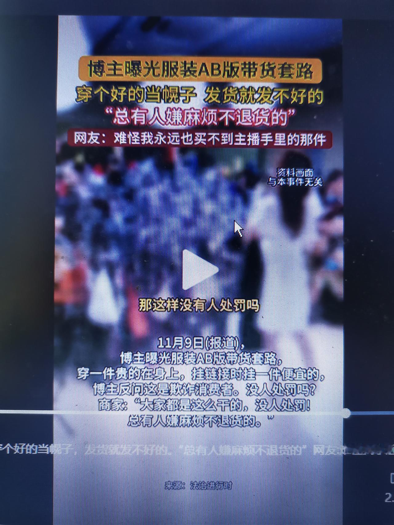 博主揭发网购服装黑幕:主播穿A货,发货B货,总有人怕麻烦,选择不退货。 明面上带