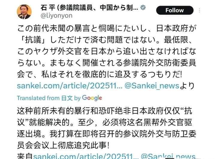 如果一个连祖宗都能出卖的败类,都能对中国外交官指手画脚,那这世界还有没有公义? 这个叫石平的,最近就跳得特别高。 面对我们外交官薛剑的正当言论,他居然颠倒黑白,污蔑为“暴行和恐吓”,甚至狂吠着要“驱逐”我们的外交官。 他凭什么?一个喝着长江水长大,却在北大毕业后转身就投靠日本的叛徒,有什么资格对我们的事务说三道四? 这早已不是政治立场的分歧,而是对全体国人情感的公然践踏。 要读懂他的狂妄,得先看看他那颗被钉在耻辱柱上的丑恶内心。 这背后,其实是一种深刻的心理危机。 一个斩断自己文化根基的人,只能通过疯狂攻击自己的过去,来向新主子摇尾乞怜,好换一点残羹剩饭。 他早被我们制裁,却依然如此激动,恰恰说明我们的制裁打中了他的七寸,打在了他永远也抹不去的历史烙印上! 他所谓的“暴行”,不过是戳到了日本右翼的痛处,说了几句他们不爱听的实话,这种玻璃心,也配谈政治? 他叫嚣着要“追究”,那副上蹿下跳的样子,活像一条被主人激怒后疯狂扑咬的狗,急得眼珠子都红了。 他以为这样就能展现自己的“能量”?他以为这样就能在日本政坛站稳脚跟? 他不知道,在日本人眼里,他这种数典忘祖的叛徒,永远只是一个随时可以丢弃的棋子,一个利用完了就能一脚踢开的工具! 历史是最好的镜子。 看看那些叛徒的下场,从汪精卫到周佛海,哪一个不是遗臭万年? 再看看国际上,那些背叛祖国的前苏联科学家,有几个得到了真正的尊重? 一旦失去利用价值,就会被迅速边缘化,最终结局大多凄凉无比。 石平这面镜子,照出的正是人性的幽暗,也恰恰反衬出我们坚守自身道路的弥足珍贵! 他的每一次狂吠,都不是对我们实力的威胁,而是在为我们敲响警钟! 所以,我们根本没必要跟这种人生气。 对于一条疯狗,你最好的回应就是不理不睬,让他在角落里自己狂吠。 我们越是愤怒,他就越是得意,我们越是要冷静,就越能看清他的可悲。 我们应该做的,是把目光放回自己身上,继续发展壮大,让我们的国家变得更加强大。 什么时候,我们的军舰可以自由地巡航在日本周边,我们的经济影响力足以让任何外部势力不敢轻举妄动,石平这种跳梁小丑,自然就会悄无声息地消失。 就连日本自己的智库都看明白了。 他们近期的报告就警告,长期纵容这类极端言论,看似迎合了右翼选民,实则是在毒化中日民间交往的土壤,最终损害的是日本自身的国家利益。 这其实也让我们想到,面对生活中那些类似的“杂音”,或许都应该学会更从容一些。 最好的回应,往往不是唇枪舌战,而是坚定地走好自己的路,让自己的强大成为最有力的回击。 对于这种跳梁小丑的表演,各位读者,你们怎么看?