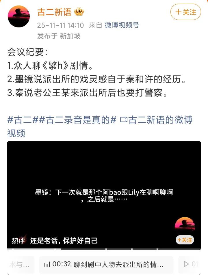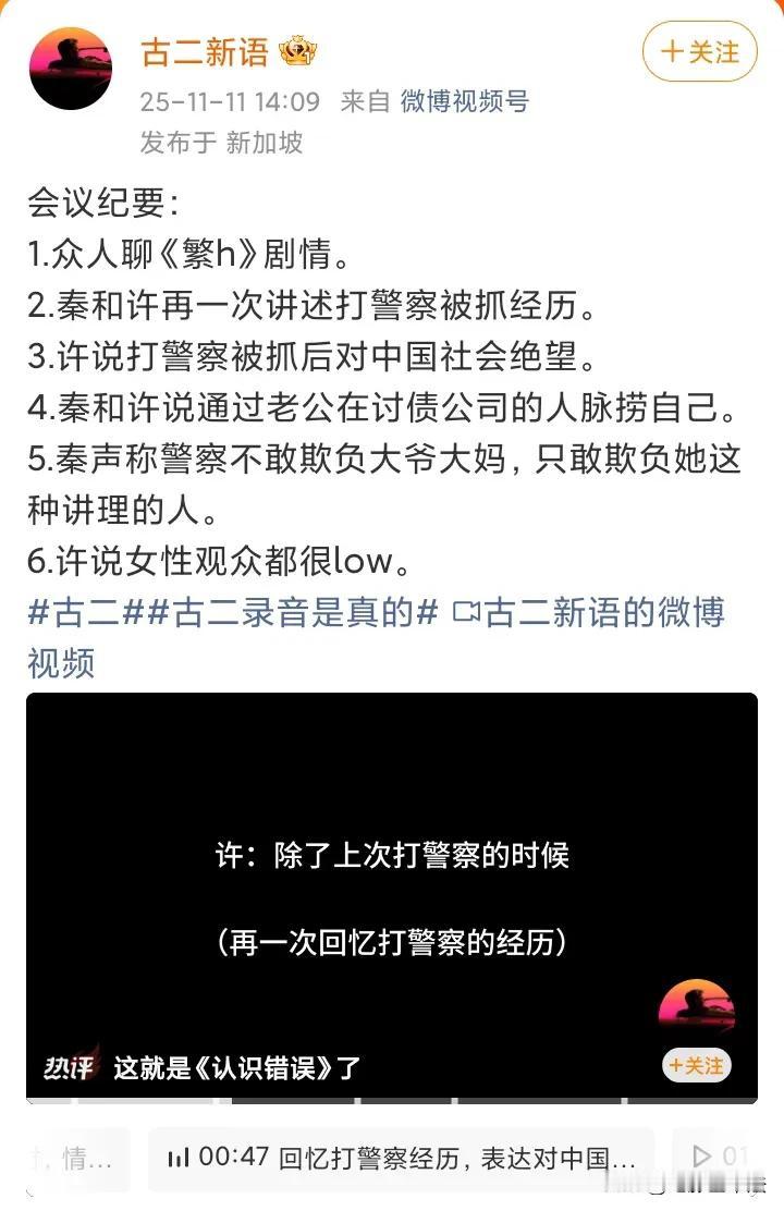 《繁花》没救了,秦雯和许真幽默,犯法被抓还对社会绝望起来了! 11月11日下午,古二又发录音了,这次秦和许肯定完蛋了,最新录音显示,她们不但攻击警察,还抹黑国家,涉嫌黑社会,甚至得罪了女权,称中国女观众都很low,这下彻底没人救得了她们了。