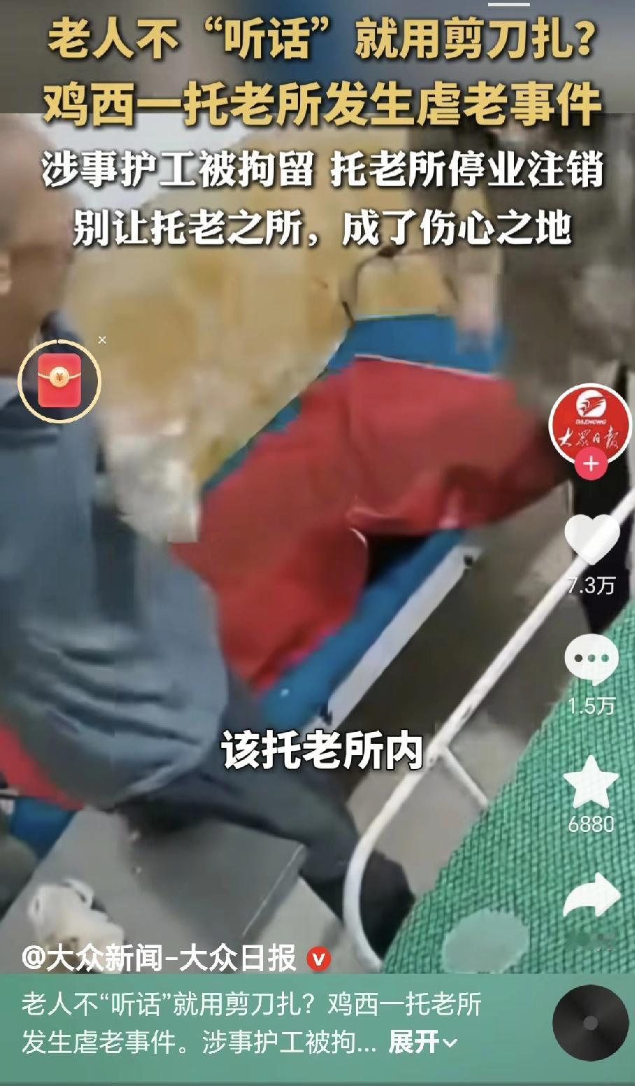 一把剪刀的寒光,刺疼了多少人对养老的期许 监控里那把挥动的剪刀,扎在老人的手背上,也扎进了每个观者的心里。本该是护佑晚年的托老所,却成了施暴的现场;本应温柔以待的护工,竟用利器对待无力反抗的老人。那道红肿化脓的伤口,不仅是身体的轻微伤,更是对生命尊严的践踏。 我们总说“老吾老以及人之老”,可当“不听话”成为施暴的借口,当岗前培训流于形式,当遍布的监控沦为事后取证的摆设,养老机构的“良心防线”早已失守 。涉事护工被拘留、托老所被注销,这些惩戒或许能告慰伤者,却难以抚平公众对养老行业的信任裂痕。 老人的今天,就是我们的明天。养老从来不是简单的“看管”,而是用耐心与尊重守护岁月的余温。愿这把剪刀带来的刺痛,能唤醒整个行业的警醒——让监管不再缺位,让培训真正入心,让每个老人都能在晚年被世界温柔以待,让养老机构成为真正的“避风港”,而非让人胆寒的“伤人地”。毕竟,善待老人,就是善待未来的我们。