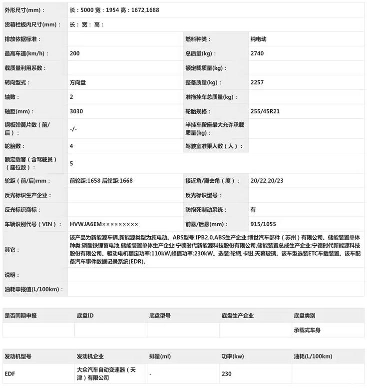 车长5米、轴距超3米,安徽大众与众08申报信息曝光。 11月10日,汽节车社从最新一期工信部目录中发现安徽大众旗下全新车型与众08申报信息。 设计方面,与众08采用了狭长且上扬的大灯组,配合中央大众品牌LOGO,辨识度不错,侧面密辐式轮圈造型,配合隐藏式车门把手。尾部方面,其采用狭长平直的尾灯组,相比车头要相对内敛。 尺寸方面,该车长宽高分别为5000/1954/1672(1688)mm,轴距为3030mm。 与众08首次实现L2++级高级驾驶辅助,可实现车位到车位功能,在高速和城市道路上的智驾能力相对出色。 动力方面,该车采用由大众汽车自动变速器(天津)有限公司生产型号为EDF驱动电机,最大功率为230千瓦。 电池方面,根据申报信息显示,其将搭载宁德时代提供的电池组,其CLTC纯电续航里程将大于700公里。 点个关注吧!汽节车社,车圈热点资讯每日一扫清!【来自懂车帝车友圈】