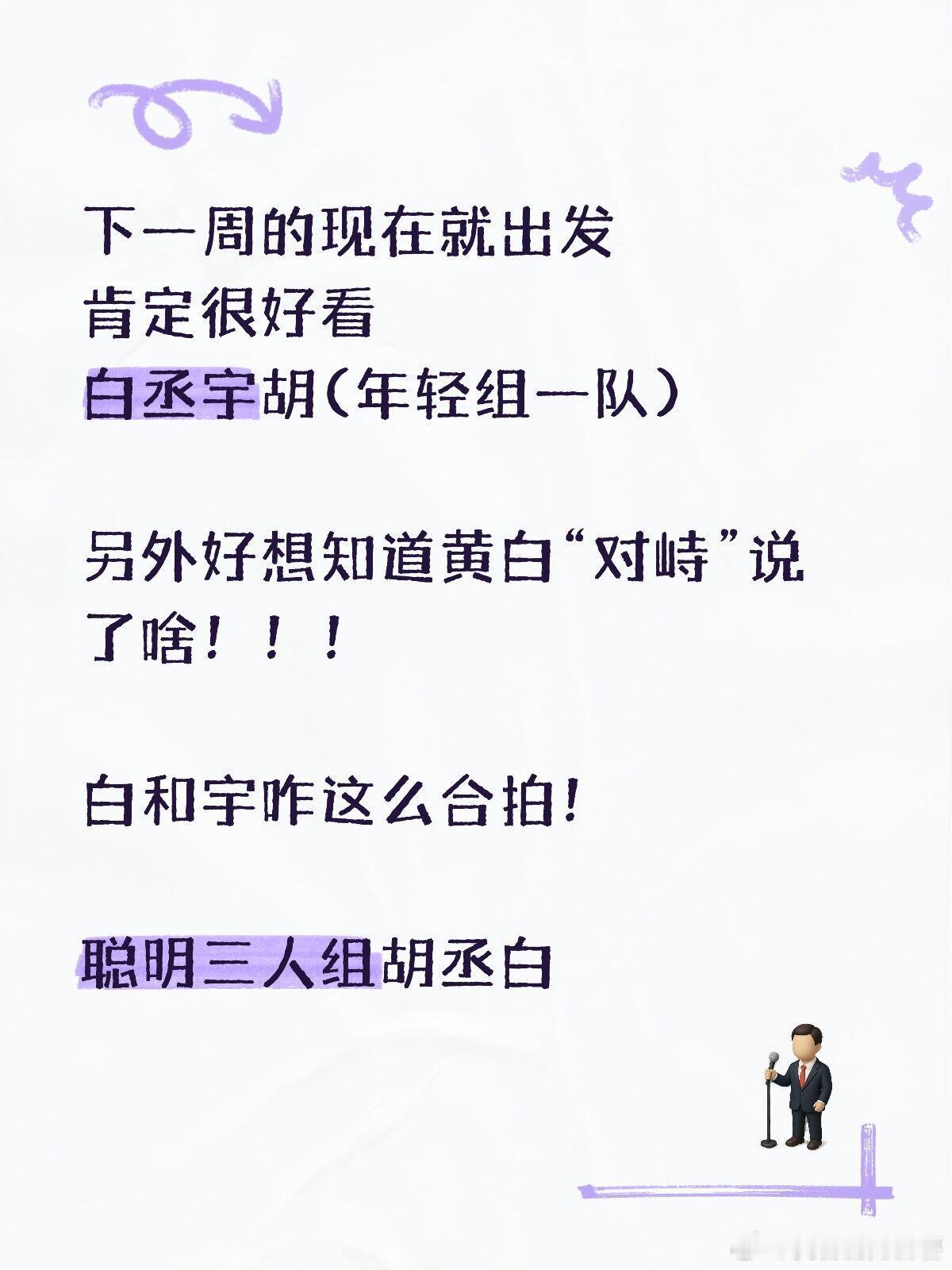 下一周的现在就出发肯定很好看白丞宇胡(年轻组一队)另外好想知道黄白“对峙”说了啥!!!白和宇咋这么合拍!聪明三人组胡丞白现在就出发|