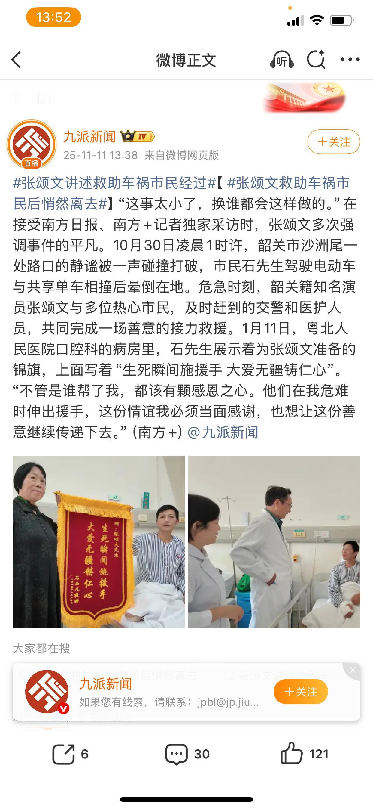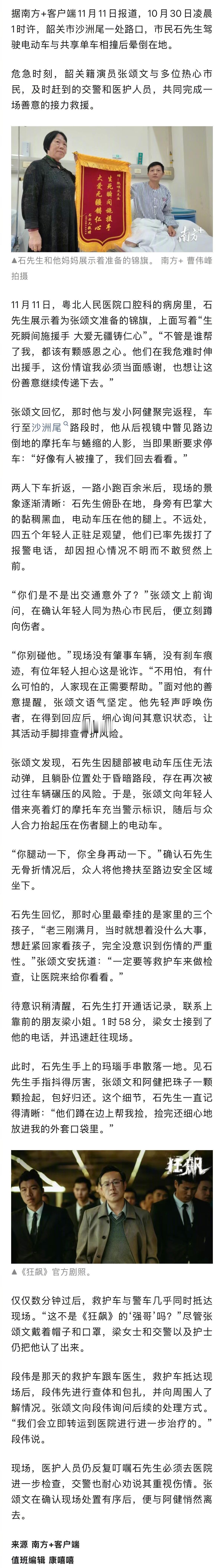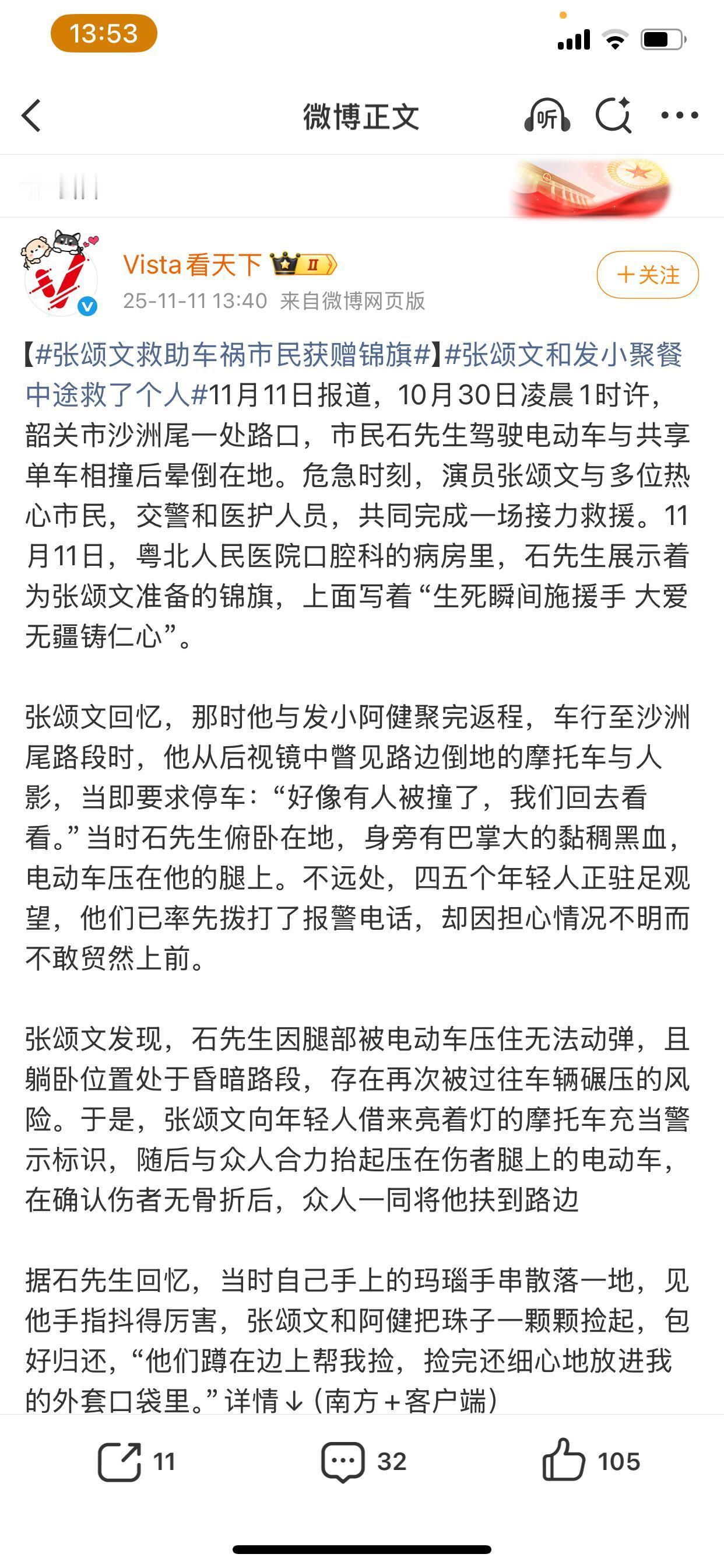 热心市民张颂文😁你给我太多惊喜了 10月30日凌晨1时许,韶关市沙洲尾一处路口,市民石先生驾驶电动车与共享单车相撞后晕倒在地。危急时刻,演员张颂文与多位热心市民,交警和医护人员,共同完成一场接力救援。11月11日,粤北人民医院口腔科的病房里,石先生展示着为张颂文准备的锦旗,上面写着“生死瞬间施援手 大爱无疆铸仁心”。张颂文回忆,那时他与发小阿健聚完返程,车行至沙洲尾路段时,他从后视镜中瞥见路边倒地的摩托车与人影,当即要求停车:“好像有人被撞了,我们回去看看。”当时石先生俯卧在地,身旁有巴掌大的黏稠黑血,电动车压在他的腿上。不远处,四五个年轻人正驻足观望,他们已率先拨打了报警电话,却因担心情况不明而不敢贸然上前。张颂文发现,石先生因腿部被电动车压住无法动弹,且躺卧位置处于昏暗路段,存在再次被过往车辆碾压的风险。于是,张颂文向年轻人借来亮着灯的摩托车充当警示标识,随后与众人合力抬起压在伤者腿上的电动车,在确认伤者无骨折后,众人一同将他扶到路边据石先生回忆,当时自己手上的玛瑙手串散落一地,见他手指抖得厉害,张颂文和阿健把珠子一颗颗捡起,包好归还,“他们蹲在边上帮我捡,捡完还细心地放进我的外套口袋里。”