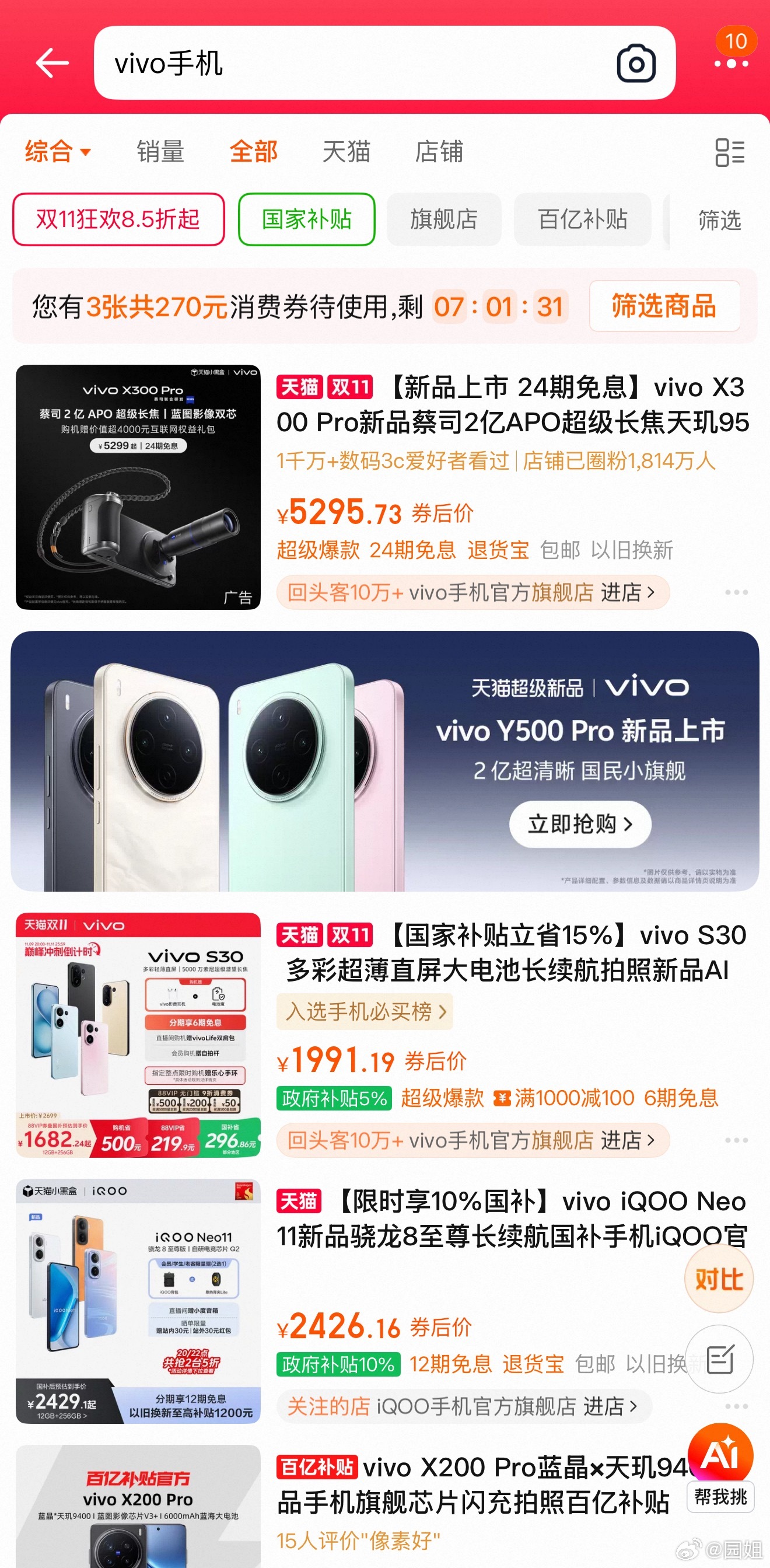 今天双十一马上就结束了,天猫各种消费券,国补,免息,秒杀都有,买手机数码产品的赶紧看看,没准捡个实惠价,错过又要等一年,今年的vivo X300和OPPO Find X9系列影像很出彩,喜欢摄影的还可以搭配摄影套装,iPhone系列也过了首发期,都有不同程度优惠,华为还有国补可以申请,怎么买都划算~
