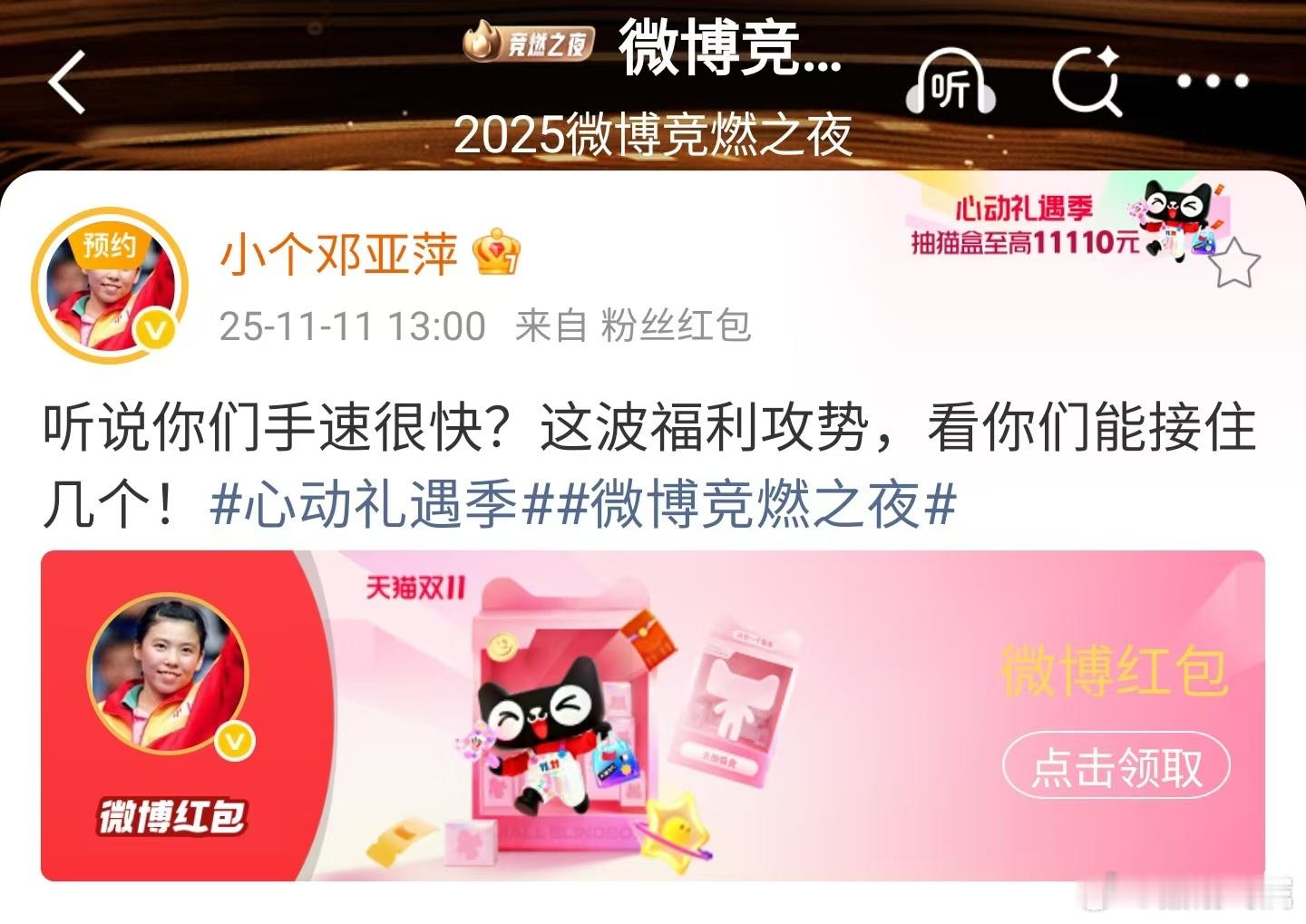 乒乓大魔王邓亚萍放大招!18个世界冠军加身,22米/秒正手爆冲的赛场传奇,如今带着天猫心动礼遇季福利强势“跨界”!从球台到屏幕,她的“快准狠”从不失手!福利三连暴击已就位:明星专属猫盒空降、整点开奖万元红包、集卡解锁惊喜折扣,每一波都像她的绝杀球般直击心动!抢货达人、抽奖锦鲤、手速王者……不管你是哪种玩家,这场大魔王认证的福利对决都别错过!能接住奥运冠军的福利快攻,才是真·手速天花板!