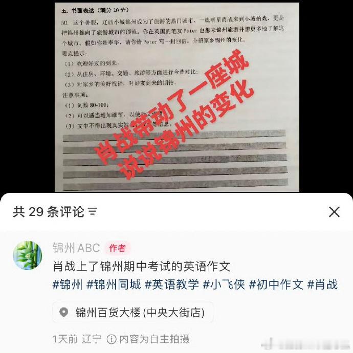 肖战登上了锦州英语作文,肖战一个人带火一座城具象化,谁来懂一下这个肖战的影响力啊~