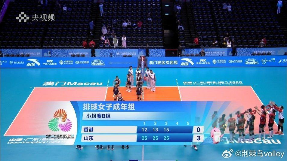 【全运女排】 B组,山东女排3-0(25-12,25-13,25-15)零封香港女排全胜战绩继续领跑。