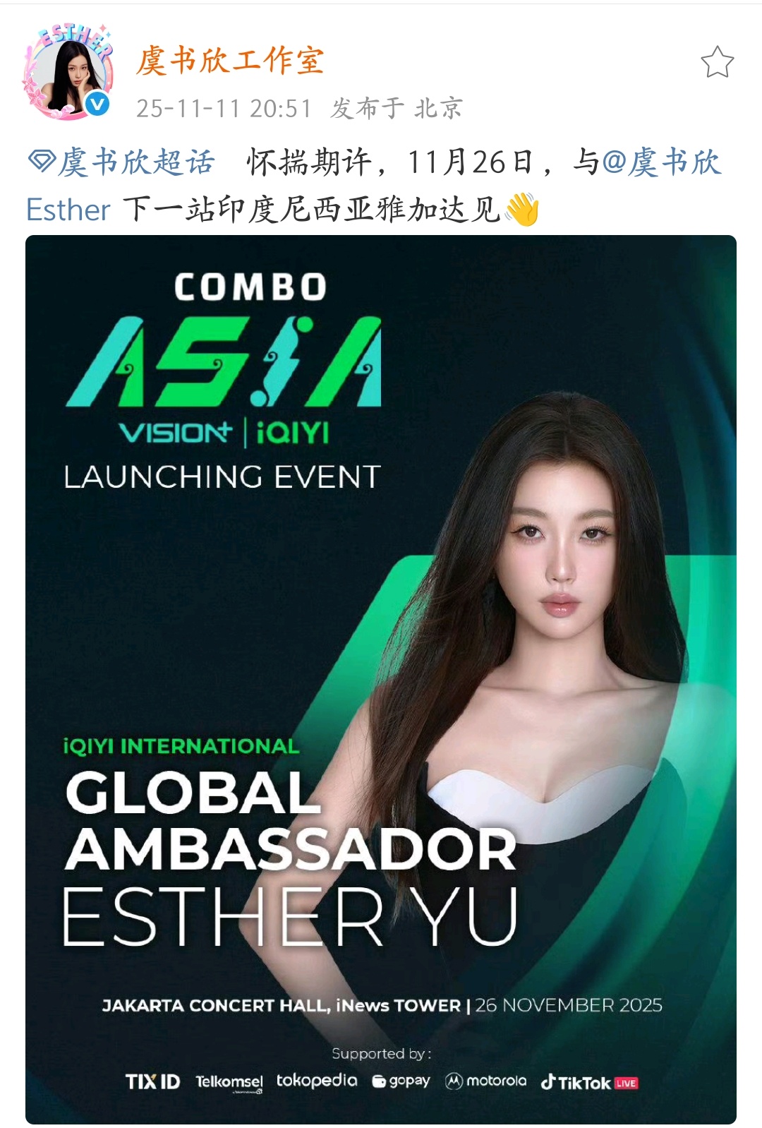 虞书欣作为特别嘉宾之星出席海外活动,期待爱奇艺国际全球大使虞书欣闪耀印度尼西亚,这个11月超幸福!!!
