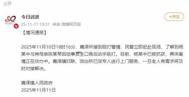 儿子家暴高龄母亲引发关注,多方介入调查处理仍存疑点 。 @椰子娱乐 :11月10号晚上江苏常州嘉泽镇有个人打了自己九十多岁的老妈,视频传网上后大家全炸锅了。警察当天就抓到打人男子杨某中,说具体情况还在查。 镇上妇联和派出所派人去照顾老人了,但很多人问为啥老人独居没人发现早些时候的事。这案子刚好碰上国家讨论老龄化问题,好多网友都在评论区问赡养老人法律到底管不管用。 现在事情还在调查,但能看出不少家庭矛盾藏着掖着,等法院最后判吧。这事得想想以后怎么解决才行。 @椰子娱乐 热门