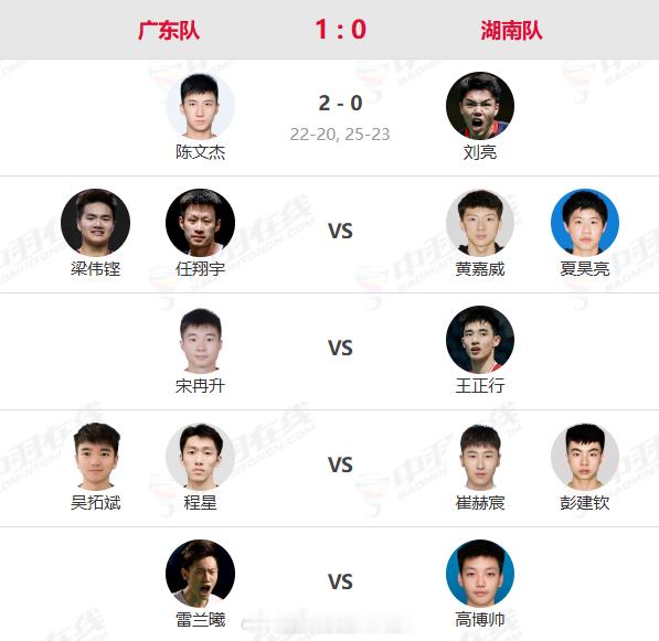 成年组男团:广东 1️⃣:0️⃣ 湖南1、陈文杰✔️ 22-20、25-23 刘亮2、梁伟铿/任翔宇 vs 黄嘉威/夏昊亮3、宋冉升 vs 王正行4、吴拓斌/程星vs 崔赫宸/彭建钦5、雷兰曦 vs 高博帅