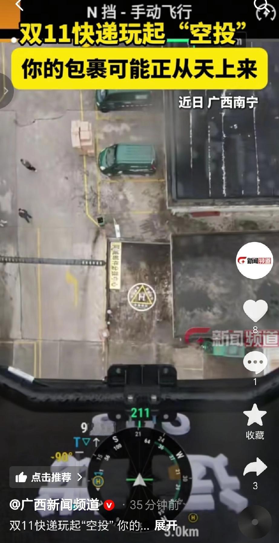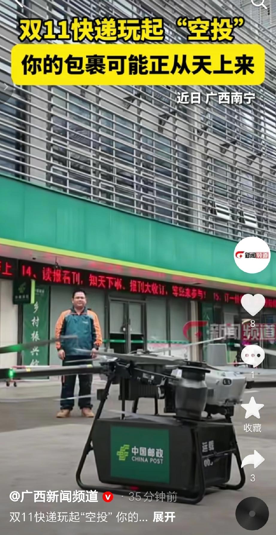 为了提升了双11期间快递的投递效率。南宁邮政使用无人机投递,无人机从南宁青秀区金浦路起飞,仅用8分钟就完成了到兴宁区望州路10公里的配送,今年南宁邮政在青秀区、兴宁区、西乡塘区建设了5个无人机起降点,投送范围覆盖市区及附近郊区。(来源于@广西新闻频道 )