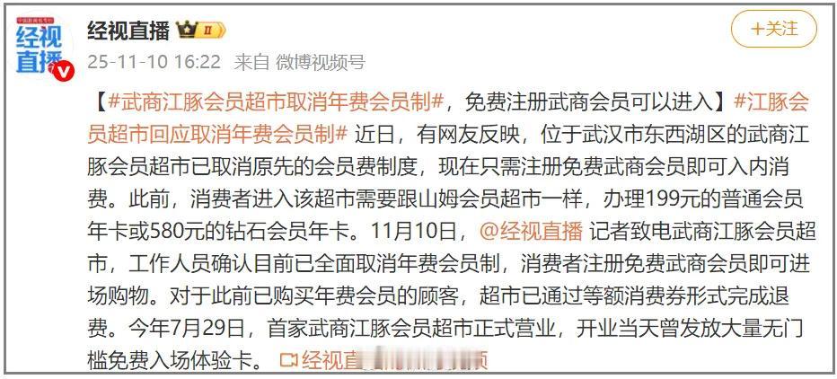 武商江豚会员超市已全面取消年费会员制! 获悉,武商江豚会员超市目前已全面取消年费会员制,消费者注册免费武商会员即可进场购物。 此前,消费者进入该超市需办理199元的普通会员年卡或580元的钻石会员年卡。对于此前已购买年费会员的顾客,超市已通过等额消费券形式完成退费。此外,第二家武商江豚会员超市正在武汉市江夏区筹备中,即将开业。武汉第二家WS江豚会员店就是位于庙山的武商超市,正在改造中。