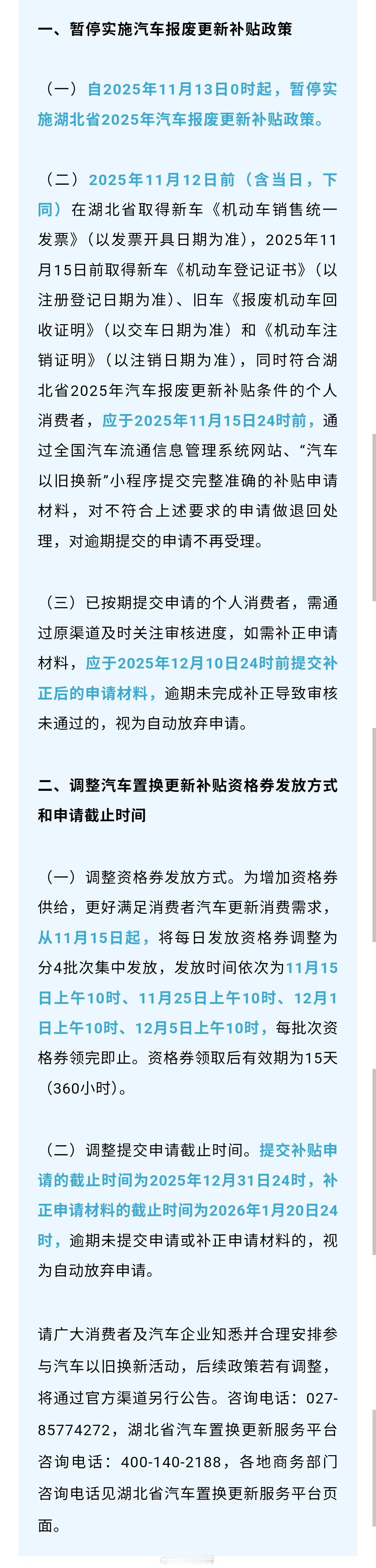 湖北省汽车以旧换新补贴政策再调整! 今天(11月11日)湖北省商务厅官网发布公告,调整2025年湖北省汽车以旧换新补贴政策,根据当前湖北省汽车以旧换新工作进展及资金使用情况,经研究,决定对2025年湖北省汽车以旧换新补贴政策进行调整。一是暂停实施汽车报废更新补贴政策,二是调整汽车置换更新补贴资格券发放方式和申请截止时间,具体见下图。
