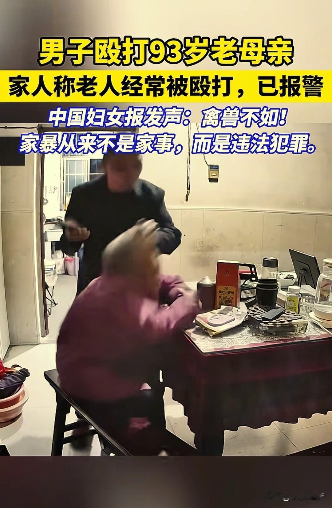 “令人发指!”江苏,一女子发了一段让全 网愤怒的视频:画面里一位壮年男子与93岁的老母亲发生了口角,男子竟然一巴掌打在老人头上,老人急忙捂着脸躲闪,不料,男子不依不饶追到厨房将她直接推倒! 根据第 一眼新闻11月11日报道,这件让人震怒的事,就发生在常州,画面里的两个人还是母 子关系!而发视频的正是老人的女儿。 从视频里可以看得出,老人被打早就不是一次两次了,男子指着老人张嘴开骂时,老人就吓得条件反射般捂住了脸,下一秒,几个巴掌就落在了老人脸上,老人疼的捂着脸哭。 而93岁的老人哪里儿子的对手,她只想逃,于是逃到了厨房,可男子几个箭步冲了过去,一把将老人按倒在地,继续落下拳头。 老人的女儿之前就怕男子会有这样的行为,特意不久之前在家里安装了监控,当女儿看到母亲经历如此遭遇后,她再也忍不下去了,直接将视频发到了网上,同时马上报了警。 当地警方接到报案后,立刻将男子抓获,还表示,老人有什么需求可以进行上门 服务处理结果后续就会公布。 有网友气的想哭:真看不了这种,孩子小时候,都是妈妈捧在手心的宝呀,长大了怎么这样了呢? 也有网友愤怒:93岁了还能活动自如,生活自理,已经是福气了,每天回去能有妈妈在多好呢。他自己年龄也这么大了,还能有妈妈喊,好多人羡慕的事,他竟然干出这种事,简直天理难容! 这事真是戳到人肺管子了!九十多岁的老母亲,从小将他养到大,结果换来的不是养老送终,而是拳打脚踢。尤其是老人吓得捂脸那个动作,就连外人看了都忍不住心疼。 男子自己也是当爹的人了,就不怕以后他的孩子有样学样吗?对这种不孝敬父母的人,就得不讲情面,必 须严惩!