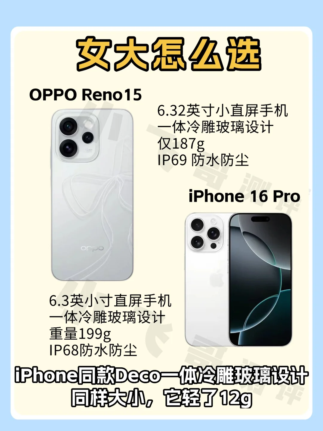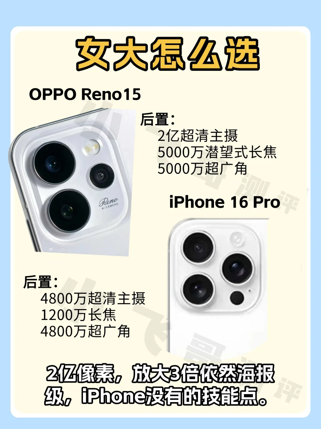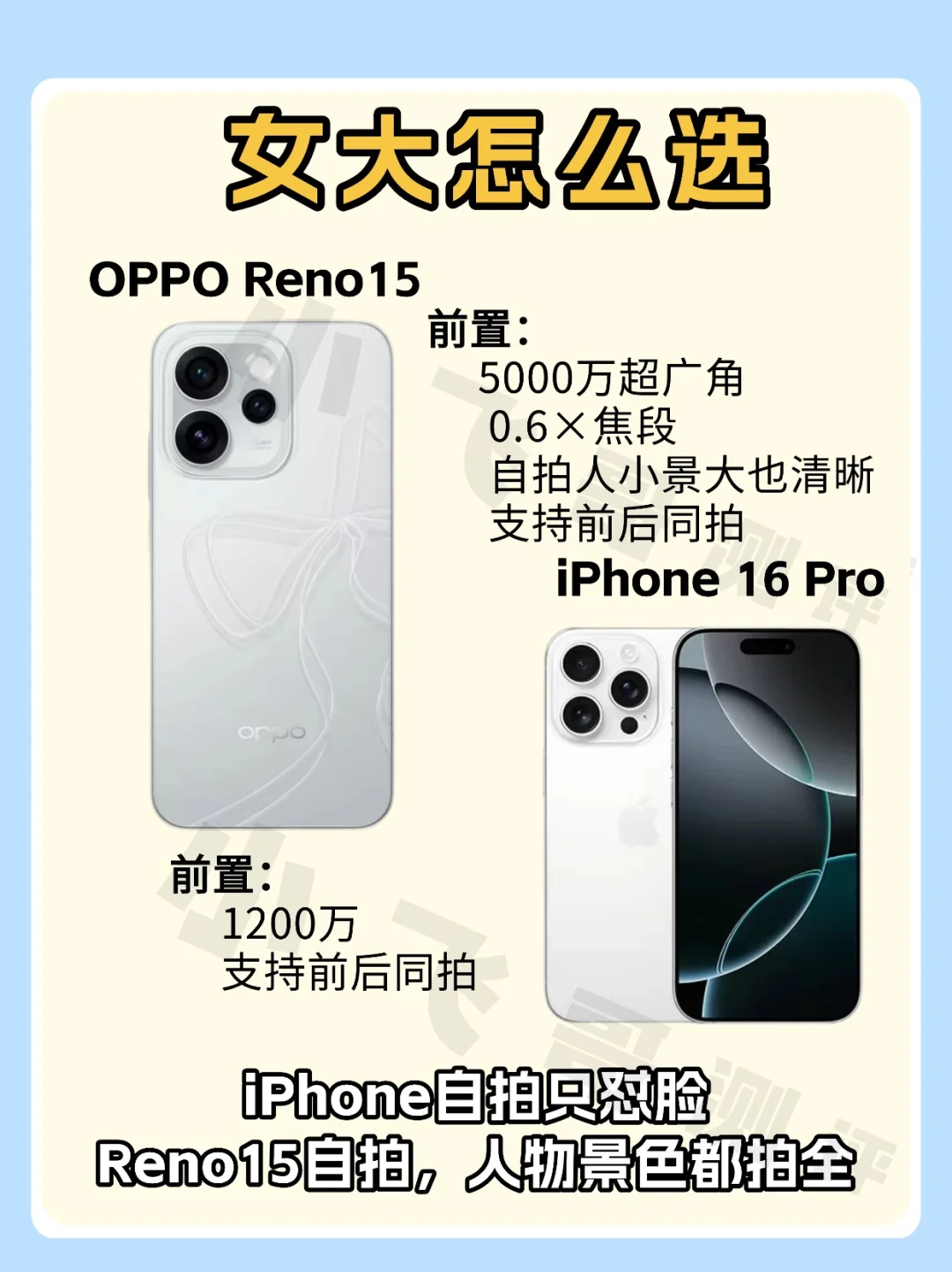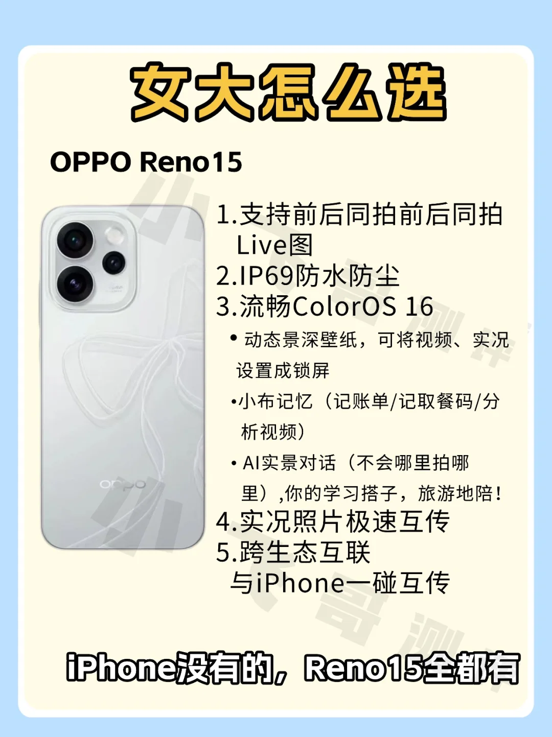 还在计划选iPhone的宝子,特别是女大学生,不如来关注这款小OPhone——OPPO Reno15 ,一定不会让你失望: