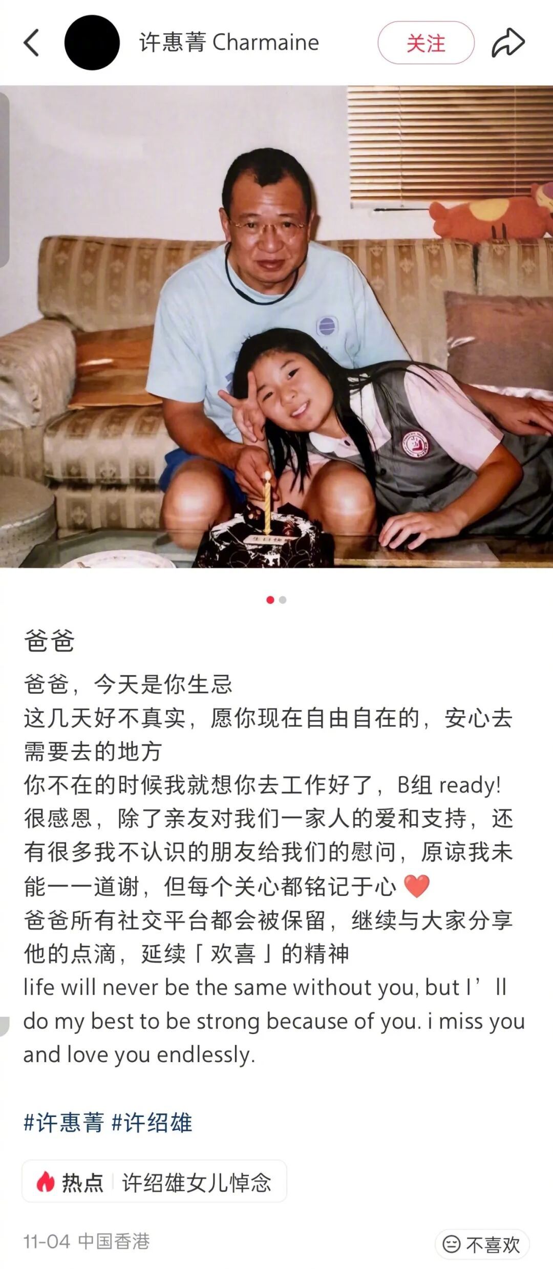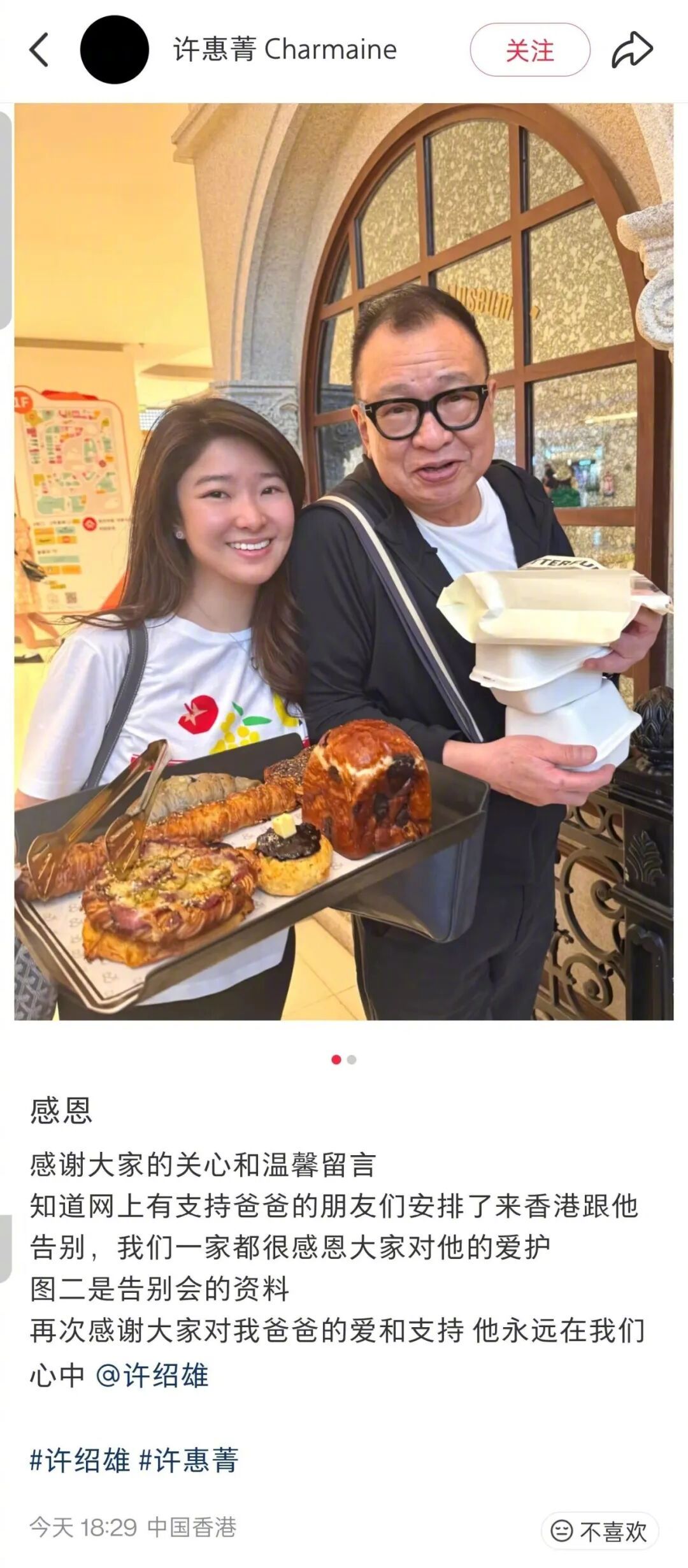 【许绍雄女儿发文,交代父亲后事安排】10月28日凌晨,香港知名演员许绍雄因癌症引发器官多重机能衰竭,在家人的陪伴下安详离世。11月11日傍晚,许绍雄女儿许惠菁通过社交媒体发文称:“感谢大家的关心和温馨留言。知道网上有支持爸爸的朋友们安排了来香港跟他告别,我们一家都很感恩大家对他的爱护。再次感谢大家对我爸爸的爱和支持。他永远在我们心中。”帖文附上了“许绍雄先生公众祭拜及传媒通告”。通告称,“我们敬重的许绍雄先生,于公历2025年10月28日安详辞世,享寿八十有余岁”。兹谨定于2025年11月17日(星期一)在香港大围宝福纪念馆地下宝福堂设灵;翌日11月18日(星期二)上午举行大殓仪式后随即出殡,灵柩奉移火化。据通告,下周一(11月17日)下午4时至5时为公众公祭时段,开放予公众人士前来致敬道别。通告提醒,为表对许绍雄先生的敬意及尊重家属意愿,任何时段于灵堂内严禁摄像录像及直播。下周一(17日)设灵及下周二(18日)大殓出殡,将以私人仪式进行,仅限亲属及好友列席。在许绍雄去世后第7天,许惠菁在社交媒体上发文悼念父亲道:“爸爸,今天是你生忌。这几天好不真实,愿你现在自由自在的,安心去需要去的地方。你不在的时候我就想你去工作好了,B组ready!“很感恩,除了亲友对我们一家人的爱和支持,还有很多我不认识的朋友给我们的慰问,原谅我未能一一道谢,但每个关心都铭记于心。爸爸所有社交平台都会被保留,继续与大家分享他的点滴,延续‘欢喜’的精神。”公开资料显示,许绍雄1948年11月4日出生于中国香港,祖籍广东汕头。1997年,48岁的许绍雄与49岁太太龙嬿喜得独女许惠菁。“欢喜哥”一路走好!