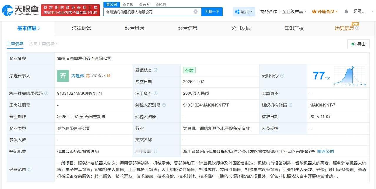 浙江仙通等在台州成立机器人公司注册资本2000万 天眼查工商信息显示,近日,台州浩海仙通机器人有限公司成立,法定代表人为齐建伟,注册资本2000万人民币,经营范围包括服务消费机器人制造、通用零部件制造、智能机器人销售等。股东信息显示,该公司由浙江仙通、上海浩海星空机器人有限公司共同持股。 天眼查信息: