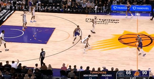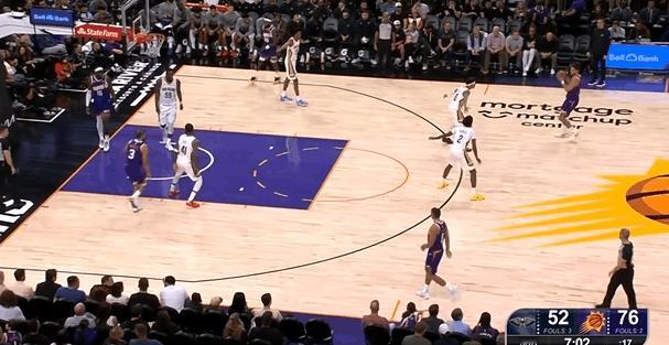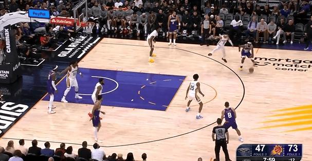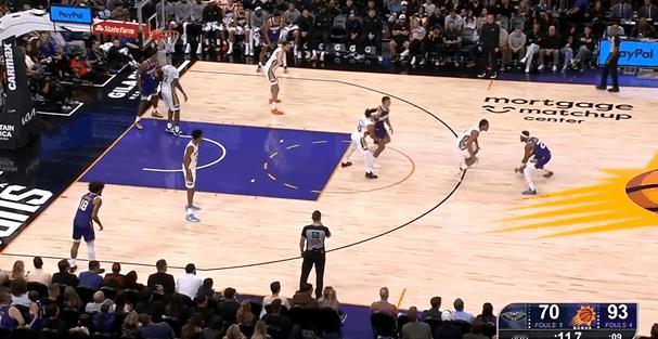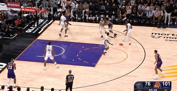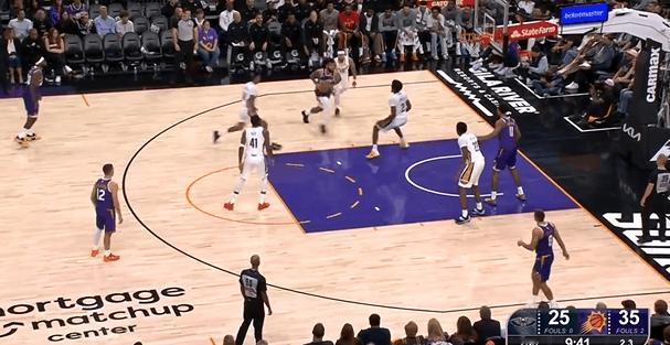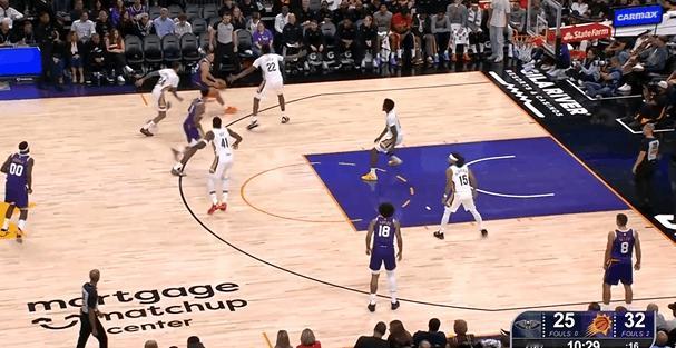太阳观察:格雷森·阿伦42分生涯之夜,10记三分射落鹈鹕图1很精彩的强弱侧衔接进攻配合:吉莱斯皮强侧边路挡拆,奎因外出延误,弱侧底角琼斯大范围回收垫防。吉莱斯皮迅速回给弧顶LOGO位置接应的罗奥,与此同时阿伦借助利弗斯的“下掩护”上提,惩罚了老六的弱侧一防二。图2“幽灵掩护”(Ghost Screen)起手接到球后没有获得投篮空间,立即衔接右路突破攻击霍金斯的前侧脚。沉肩对抗、支肘获得出手空间后顺势衔接左手抛投。图3同样“幽灵掩护”(Ghost Screen)起手,三分线外一步接球就射。图4三分线外接球直接出手,攻击鹈鹕的联防结合部。图5与上个回合同理,这个回合三分线外两步远直接出手。图6还是幽灵掩护,老六和皮维换防沟通失误,阿伦接球后顶着飞扑的墨菲三分命中。图7弱侧接应突破直接过掉霍金斯,躲过皮维的刷卡后再通过慢三步节奏晃飞老六,最后反篮终结。图8、图9弱侧接应&定点进攻