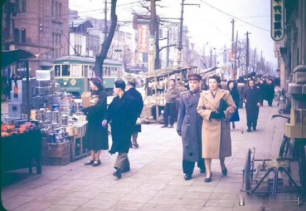 在俄罗斯网站上,无意间发现了这张老照片。这张老照片具有极高的趣味性,促使我迫切地想要与大家一同分享。 1950年1月,东京市中心,银座这个集商业与娱乐为一体的街区。可为何这里会出现一位身着质地精良军大衣的苏联军官呢? 此人当是苏联驻日本军事代表团的成员。当时随着冷战局势日益紧张,美国占领当局首脑麦克阿瑟很快便叫停苏联代表团在日本的活动,代表团成员自然会返回苏联。与他并肩而行的这位女士,着装在当时可谓极为奢华,与1950年东京这座略显破败的城市中心里那些日本女性相比,她的装扮要夺目得多。