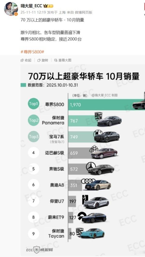 【国内 70 万以上超豪华轿车 10 月销量出炉,尊界 S800 稳定近 2000 辆位列第一】汽车销量数据追踪和分析团队 ECC 情报局的博主 嗨大星 分享了 70 万以上超豪华轿车 10 月销量排行榜,其中尊界 S800 以 1970 辆的月销量登顶该榜,超第二名保时捷 Panamera 的销量(767 辆)一倍有余。尊界 S800:1970 辆保时捷 Panamera:767 辆宝马 7 系(含宝马 i7):749 辆迈巴赫 S 级:659 辆奔驰 S 级:572 辆奥迪 A8:351 辆仰望 U7:197 辆蔚来 ET9:127 辆保时捷 Taycan:80 辆博主称,跟 9 月相比,各车型销量普遍下滑,尊界 S800 相对稳定,接近 2000 台。鸿蒙智行尊界 S800 轿车于今年 5 月 30 日发布,售价 70.8 万-101.8 万元。最新数据显示,该车上市 4 个月累计大定突破 1.5 万辆,单周交付量突破 500 台。尊界 S800 配备创新智慧电动门,联动毫米波雷达和固态激光雷达,能够实现智能感应动静态障碍物,自动调节开启角度,最大开门角度 77 度,同时还拥有智能迎宾光毯。新车车身尺寸 5480×2000×1542mm,轴距 3370mm。该车搭载华为临境抬头显示系统,首发智能可变星空顶,实现首个轿车后排双零重力座椅布局。智能化方面,新车首发搭载 HUAWEI ADS 4,搭载 HUAWEI DriveOne 800V 高压碳化硅电机,双电机最大输出功率 390kW、三电机最大输出功率 635kW。增程版综合续航 1333km,纯电版 CLTC 续航 702km。