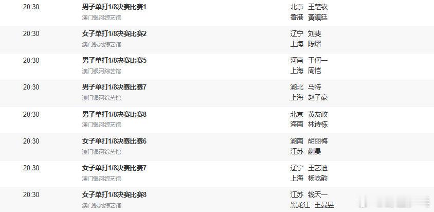 12:30 女单1/8 1号台 孙颖莎vs王晓彤 12:30 男单1/8 2号台 林高远vs牛冠凯 12:30 女单1/8 3号台 陈幸同vs臧小桐 12:30 男单1/8 4号台 樊振东VS薛飞12:30 女单1/8 5号台 朱雨玲VS李雅可12:30 女单1/8 6号台 陈梦vs何卓佳12:30 男单1/8 7号台 袁励岑VS陈俊菘12:30 男单1/8 9号台 孙正VS高杨20:30 男单1/8 王楚钦vs黄镇廷20:30 女单1/8 陈熠vs刘斐20:30 男单1/8 周恺vs于何一20:30 男单1/8 赵子豪vs马特20:30 男单1/8 林诗栋vs黄友政20:30 女单1/8 蒯曼vs胡丽梅20:30 女单1/8 王艺迪vs杨屹韵20:30 女单1/8 王曼昱vs钱天一