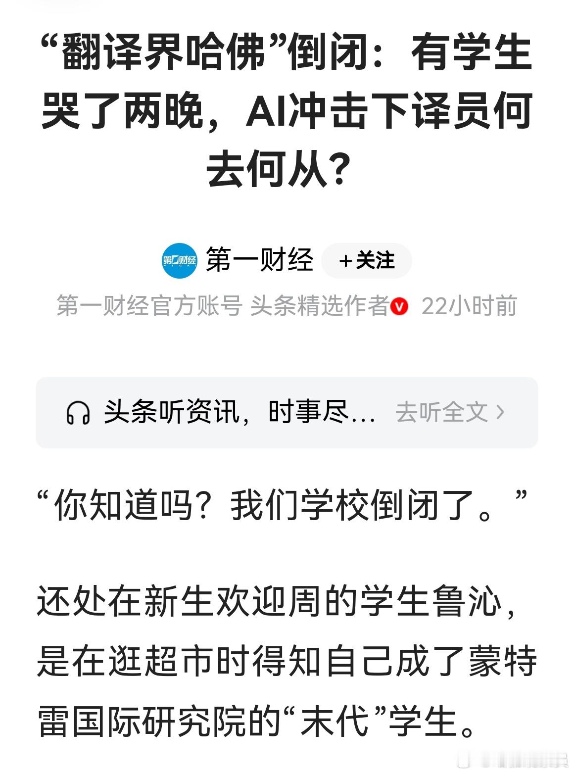哭也没用,该来的总会来。翻译曾经是香饽饽职业,马云当初就是靠接一些文稿翻译工作而起家的。尤其是同声传译人才,长期以来都是高收入职业。但也就是近十来年工夫,AI翻译软件上位了,而且日臻完善。翻译院校萎缩、人员失宠也成了自然而然。在这个技术巨变时代,一定还有不少传统的“高大上”职业会逐步让位给AI,这也就是未来三五年的事。