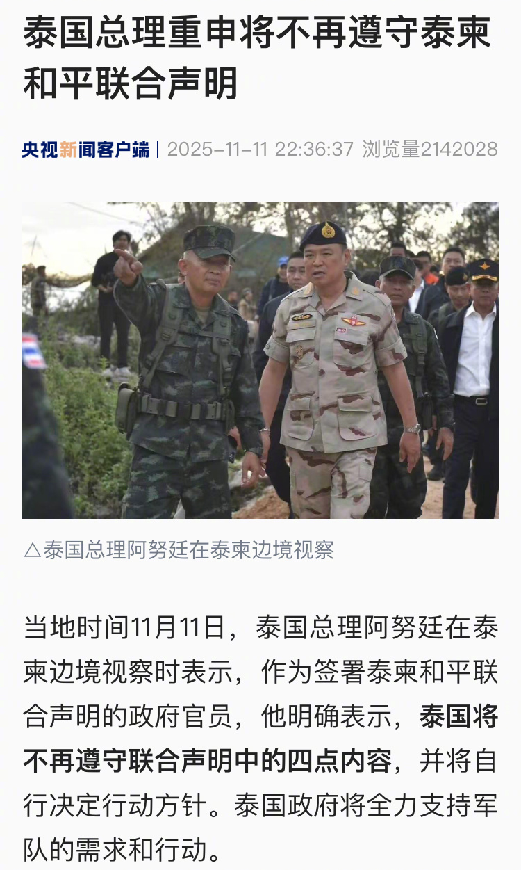 【】当地时间11月11日,泰国总理阿努廷在泰柬边境视察时表示,作为签署泰柬和平联合声明的政府官员,他明确表示,泰国将不再遵守联合声明中的四点内容,并将自行决定行动方针。泰国政府将全力支持军队的需求和行动。柬埔寨方面对此暂无回应。(央视新闻)