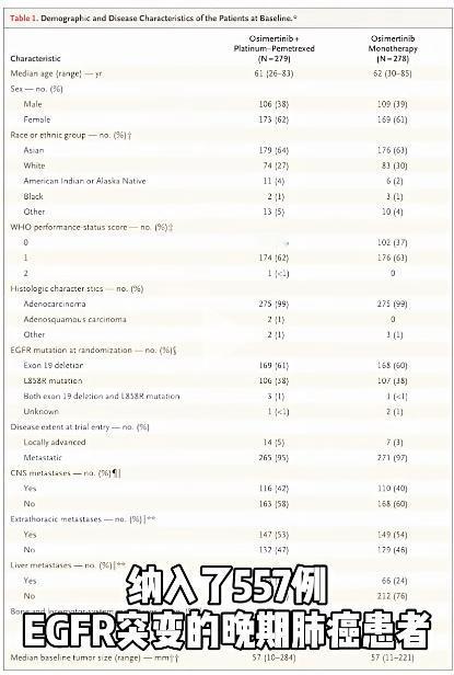 《新英格兰医学杂志》发表了一项,针对EGFR突变晚期肺癌患者的重要研究,该结果已被纳入最新临床指南。研究共纳入557例患者,按1:1随机分为两组:A组接受奥希替尼单药治疗; B组为联合治疗组,采用奥希替尼联合培美曲塞及铂类化疗;4个周期后,继续以奥希替尼联合培美曲塞进行维持治疗。 研究主要评估指标包括无进展生存期(PFS)、客观缓解率(ORR)以及安全性。结果显示,联合治疗组的中位PFS较单药组显著延长近10个月,肿瘤控制更为明显,ORR高达83%。 然而,联合组的3级以上不良反应发生率也更高,主要表现为骨髓抑制、胃肠道反应等化疗相关毒性。 研究结论认为,在EGFR突变晚期肺癌患者的一线治疗中,奥希替尼联合化疗可显著延长无进展生存期,但需综合评估化疗所带来的副作用,进行个体化权衡。 基于以上结果,我们可以得出以下启示: 1、靶向与化疗的协同作用:靶向药物奥希替尼能精准抑制EGFR突变肿瘤细胞,而化疗可清除不依赖EGFR信号通路的癌细胞。两者联合能更全面地抑制肿瘤,延缓耐药,进而延长患者生存。 2、重视化疗副作用:联合治疗组中3级以上不良反应更为常见,尤其对于老年或体质较差的患者,需谨慎评估其耐受性,结合年龄、身体状况及肿瘤负荷等因素制定个体化方案。 3、适用人群的考量:该研究提示,肿瘤负荷较高(如多发转移、脑转移或骨转移)的患者,可能需要更强效的治疗方案。 年轻、耐受性良好的患者,因对化疗副作用承受能力更强,可能从联合治疗中获益更大,有望实现更长的生存期。[玫瑰][作揖]