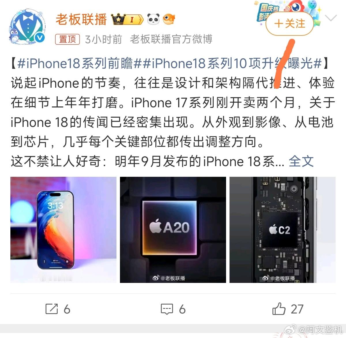 这老板联播是苹果买了年框吗?搞苹果热搜这么卖力,这iPhone 17还没捂热乎呢,又开始搞iPhone 18的新闻了?还传的有模有样的,不得不说,果子还是有关注度,这种完全是凑数的内容也能上热搜,可以预见,接下来这类水文定期就会出一堆热搜内容。相比iPhone 18,我更关心苹果的折叠屏。