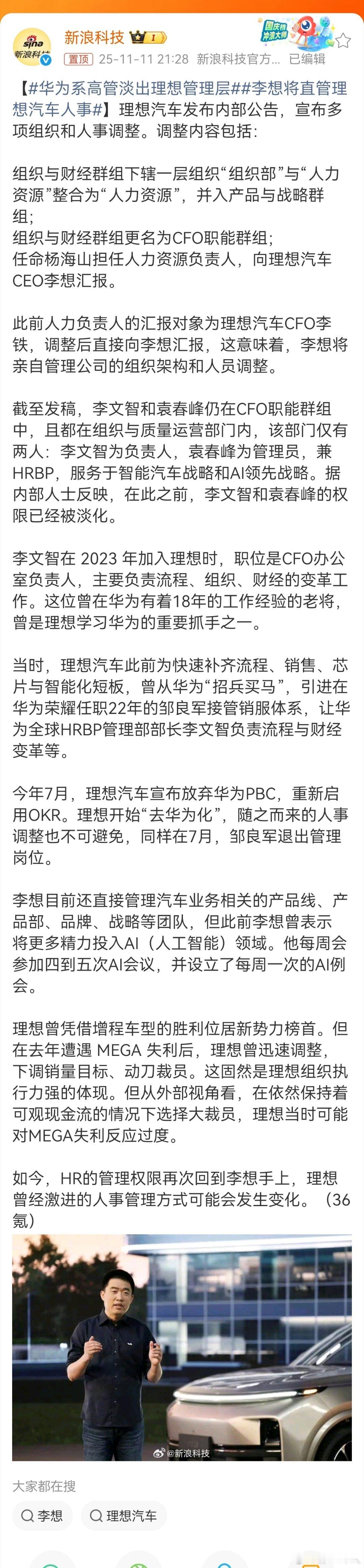 华为系高管淡出理想管理层:理想汽车发布内部公告,宣布多项组织和人事调整。学华为,最重要的是学老板分钱,钱散人聚,像任总和华为那群高层那么慷慨的群体很少,他们愿意只拿一点点,而不是去当首富上富豪榜,这点很不容易。学华为,要学华为对质量的一丝不苟,产品经理在质量末位淘汰。学华为,要学华为的战略耐性,忍住寂寞,厚积薄发。所以理想不是学华为学错了,而是真的学华为什么的问题。管理和流程的形似不关键,关键是管好上面。