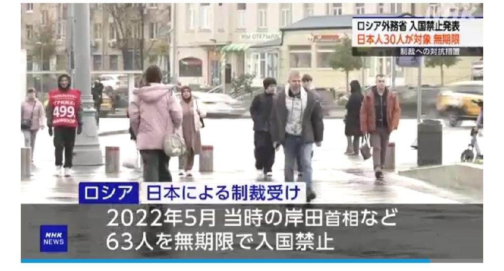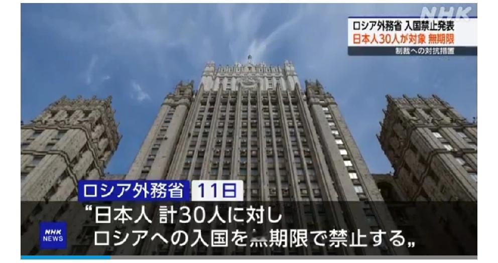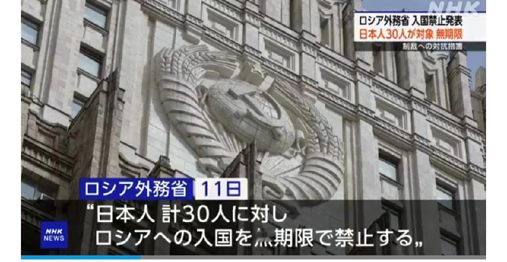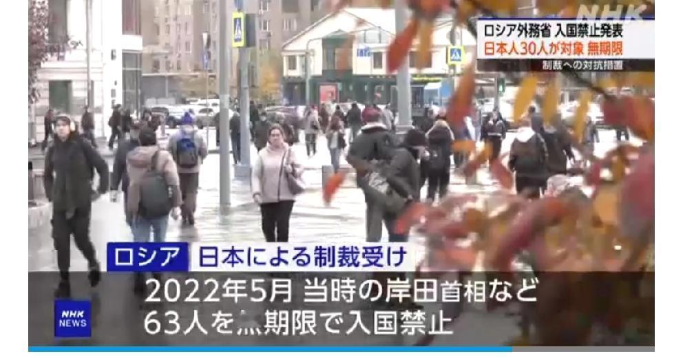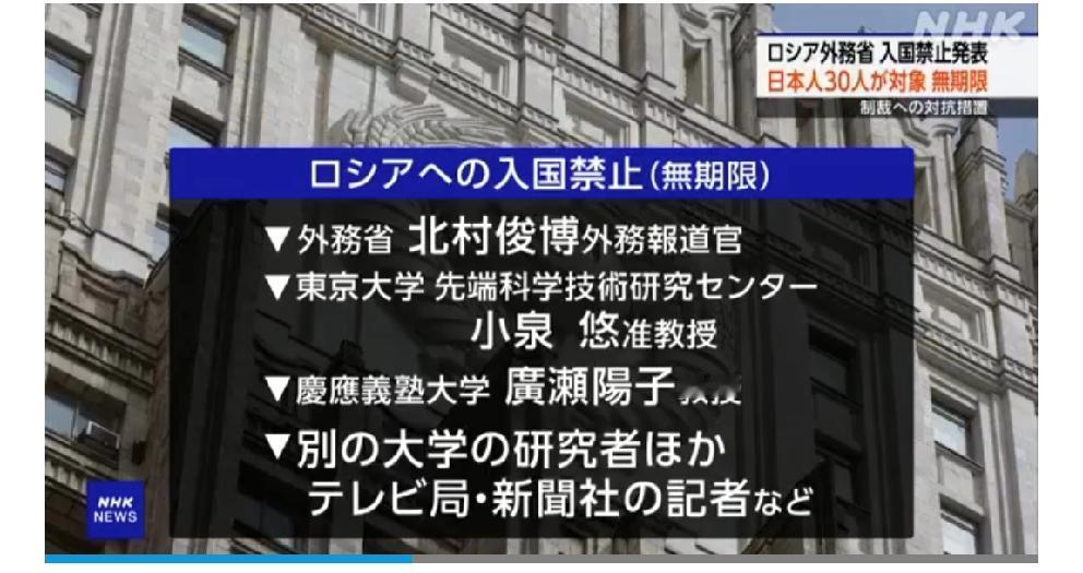 俄罗斯外交部宣布对30名日本人实施无限期入境禁令 日媒11月12日报道,俄罗斯外交部以日本持续对俄制裁的反制措施为由,宣布对包括外务省报道官北村俊博、东京大学先端科学技术研究中心准教授小泉悠等在内的30名日本人实施无限期入境禁令。俄方称此举与“特别军事行动”相关 。 俄罗斯外交部于11日宣布,作为针对日本政府持续对俄制裁的反制措施,将无限期禁止包括30名日本人在内的相关人员入境俄罗斯。声明称此举是与特别军事行动相关的对抗措施 。 被列入禁止名单的人员包括:日本外务省发言人北村俊博,东京大学尖端科学技术研究中心副教授小泉悠(俄罗斯安全保障问题专家),庆应义塾大学教授广濑阳子(前苏联及东欧政治问题专家)等 。 此外,还包括其他大学的研究者以及电视台和报社的记者等。 俄罗斯在受到日本制裁后,于2022年5月对时任首相岸田文雄等63人实施了无限期入境禁止,此后还多次对外交官、国会议员和企业相关人员等实施入境禁止。 今天的日俄关系实际上处于准开战状态,日本紧跟美国和北约对抗俄罗斯的步伐走,甚至其对抗俄罗斯的烈度超过美国和北约。