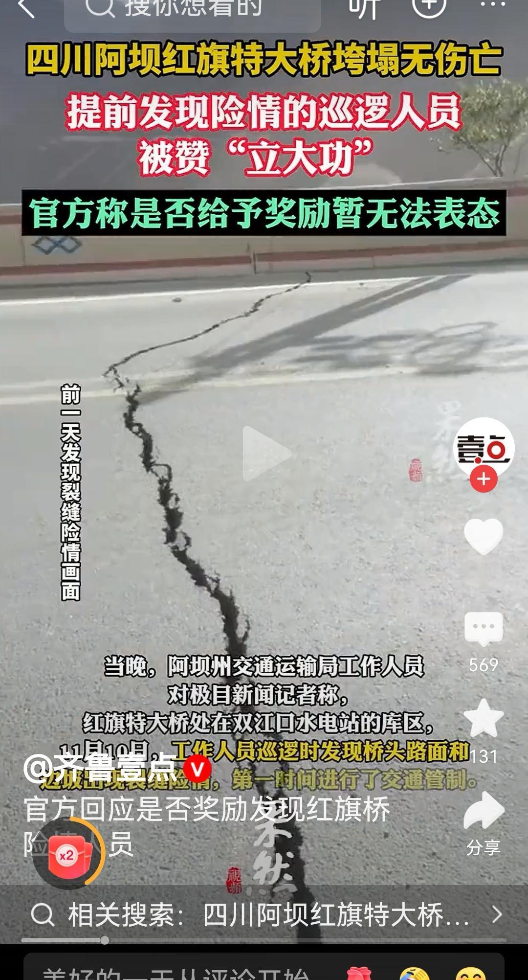 特大功劳 四川阿坝红旗特大桥垮塌 之前巡路员发现了裂缝 及时上报 才避免了可能发生的事故 该奖 可是1月才竣工的桥 怎么11月就垮了呢?