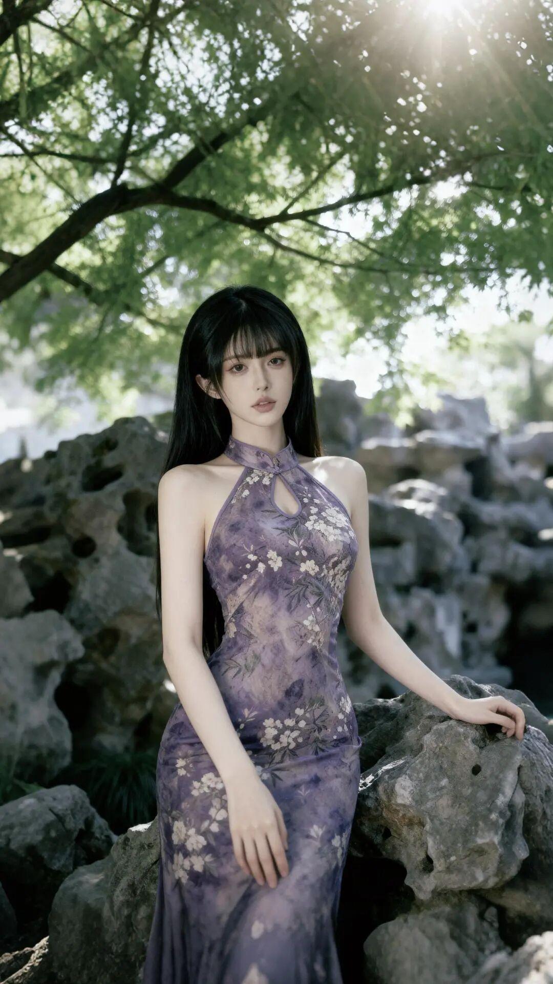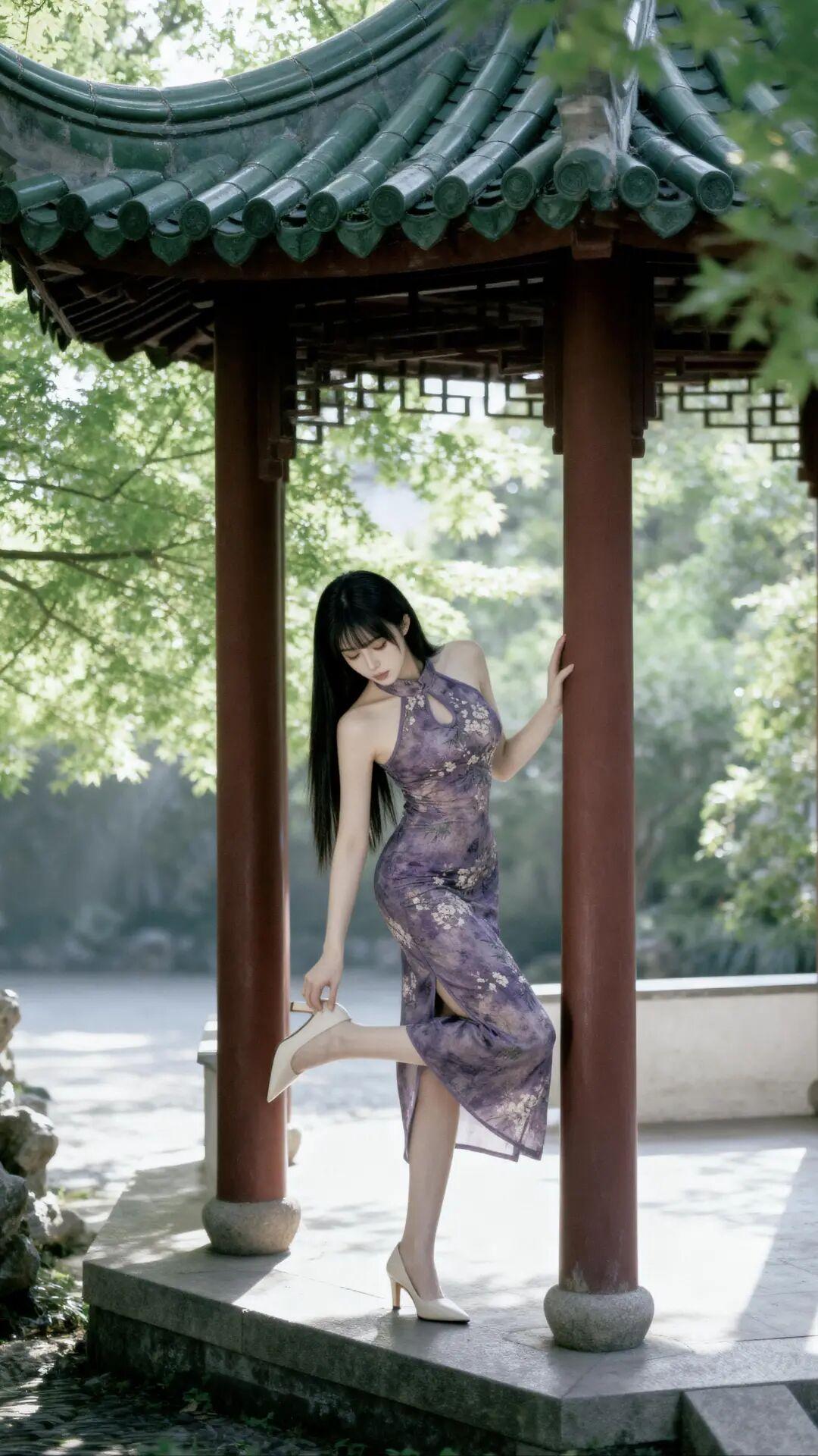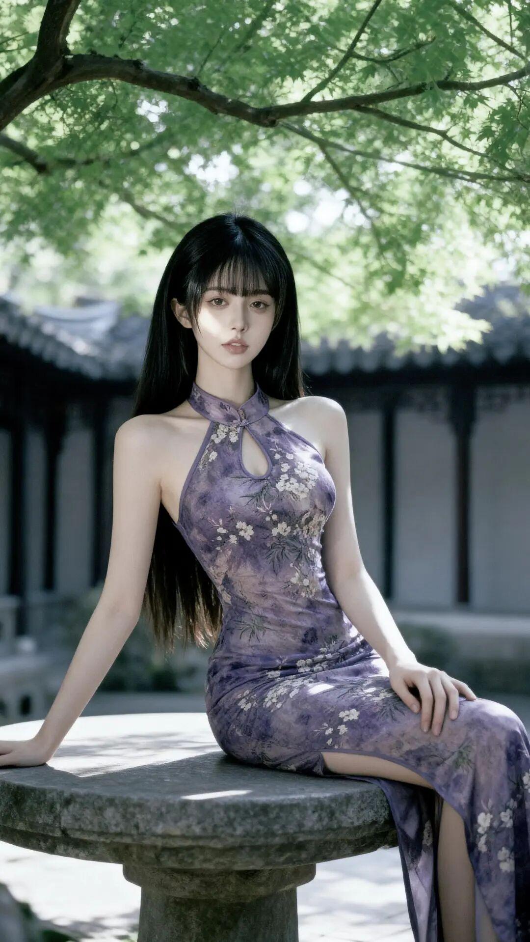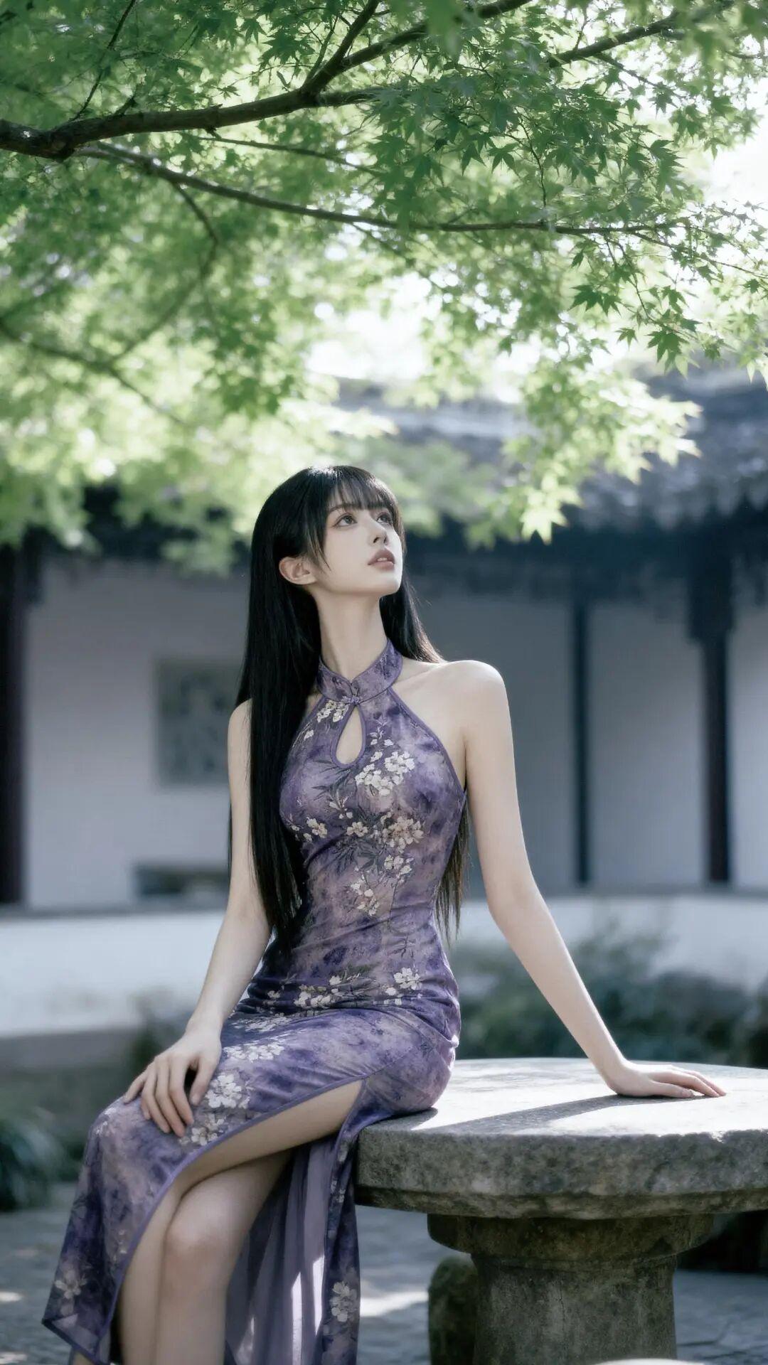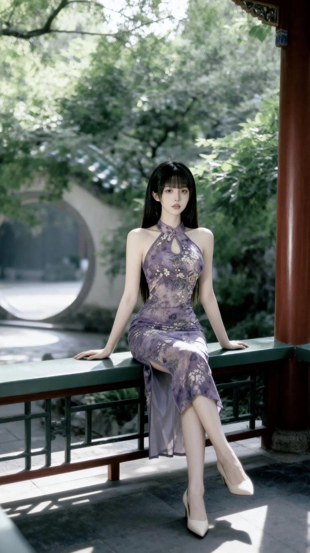 紫韵华章——旗袍里的东方美学 在光影交织的静谧空间里,她身着紫色旗袍,仿佛一幅流动的东方画卷缓缓展开。这件旗袍不仅是服饰,更是承载千年文化精髓的艺术品,每一处细节都诉说着东方美学的深邃与优雅。 立领之韵:颈间的文化密码 立领设计如挺拔的翠竹,将颈部的线条勾勒得修长而典雅。领口处点缀的刺绣装饰,以丝线为笔,绣出繁复精美的花纹,似古代仕女手中的团扇,轻轻摇动间便洒落一地诗意。这种设计不仅是对传统服饰的致敬,更是对东方女性含蓄内敛之美的完美诠释。 花卉图案:自然与人文的和谐交响 旗袍上的花卉图案,宛如春日花园中最绚烂的景致。每一朵花都经过精心设计,色彩搭配和谐而不失层次,既有牡丹的雍容华贵,也有梅花的清雅高洁。这些图案不仅是装饰,更象征着东方文化中对自然与人文和谐共生的向往,体现了“天人合一”的哲学思想。 黑色背景:神秘与高贵的完美映衬 纯黑色的背景如同深邃的夜空,将紫色旗袍的华丽与神秘衬托得淋漓尽致。这种极简的背景设计,不仅突出了旗袍的色彩与细节,更营造出一种超脱尘世的氛围,让人仿佛置身于一个只属于东方的梦幻世界。 坐姿之美:优雅的东方礼仪 她的坐姿端正而优雅,背部挺直,双手自然垂放,展现出东方女性特有的端庄与娴静。这种姿态不仅是对旗袍修身效果的完美展示,更是对东方礼仪文化的传承与弘扬。每一个动作都透露着从容与自信,仿佛在诉说着一个关于东方美学的古老故事。 结语:旗袍里的东方美学 这件紫色旗袍,以其立领之韵、花卉图案、黑色背景以及坐姿之美,共同构成了一幅生动的东方美学画卷。它不仅是服饰,更是文化的载体,让我们在欣赏其美丽的同时,也能感受到东方文化的深厚底蕴与独特魅力。在这个快节奏的现代社会中,这样的旗袍无疑成为了一种难得的宁静与优雅的象征,引领我们回归内心的平和与美好。