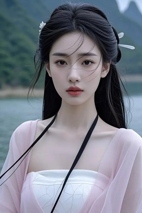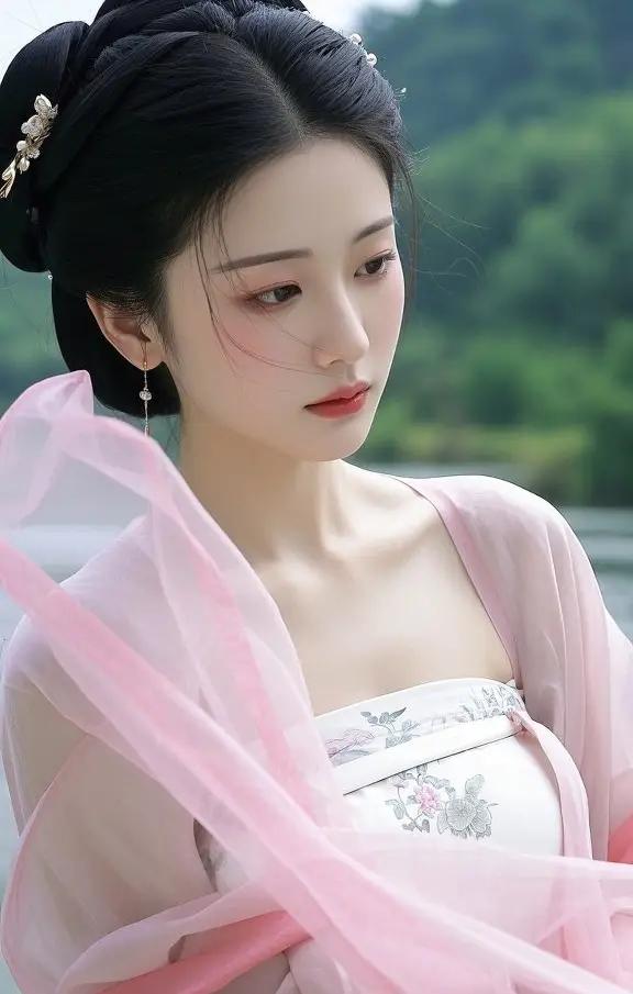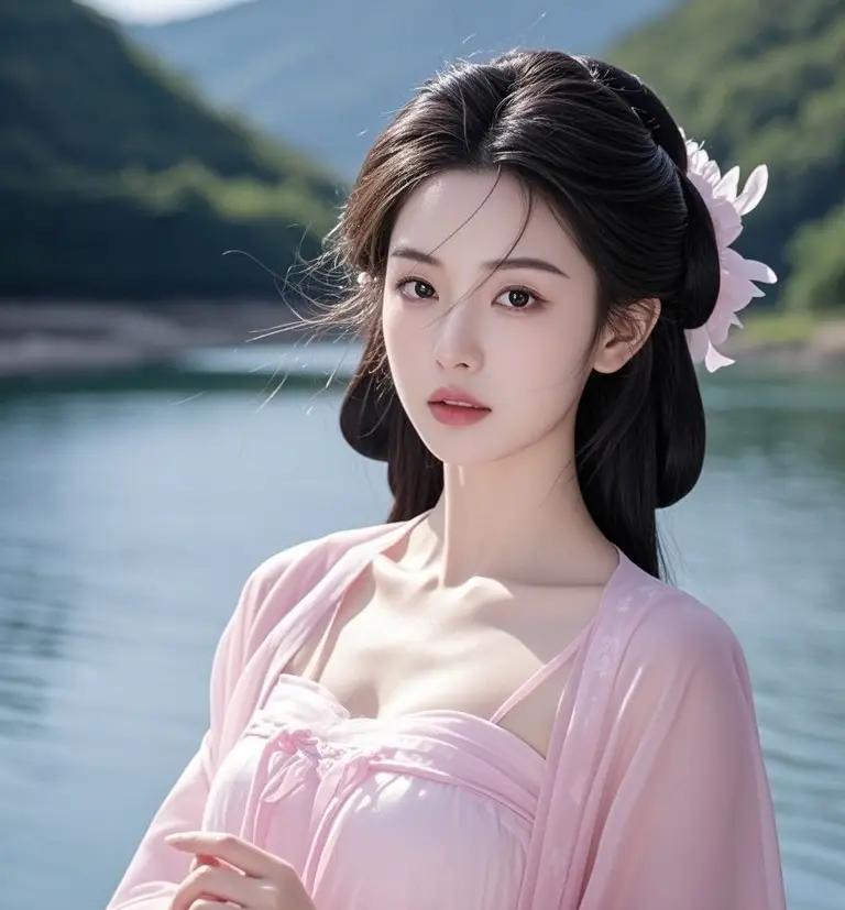 《湖畔佳人,古韵流芳》 在时光的长河中,古典之美如同一颗璀璨的明珠,散发着永恒的光芒。那位身着浅粉色汉服的女子,便是这古典之美的生动诠释。 她站在宁静的湖畔,浅粉色的汉服在微风中轻轻飘动。那汉服的设计简洁大方,恰到好处地露出部分肩膀,将柔美与典雅完美融合。汉服的材质似乎轻薄如纱,却又带着丝丝坚韧,仿佛承载着千年文化的厚重。衣袂随风舞动,宛如一幅流动的诗画,诉说着古老的故事。 她的头发乌黑亮丽,梳成了古典的发型,发间的白色花朵如同点点繁星,点缀在乌黑的发丝之间。这些花朵清新柔美,为她的整体形象增添了几分灵动与生机。她的面容平静而安详,眼神中透露出一种深邃的宁静,仿佛与这片湖水、这些山峦和树木融为一体。 背景中的湖水宛如一面镜子,静静地映照着周围的一切。远处的山峦起伏,树木郁郁葱葱,与湖面相映成趣。整个环境幽静而和谐,仿佛是一个与世隔绝的仙境。这种自然与人文的完美结合,营造出一种独特的氛围,让人仿佛置身于古代的画卷之中。 这位身穿传统服饰的女性,她的形象不仅仅是一个美丽的画面,更是一种文化的传承。她让我们看到了古代女性的优雅与从容,也让我们感受到了传统文化的魅力与底蕴。在这片宁静的湖畔,她如同一朵盛开的花朵,绽放着古典之美,让我们的心灵得到了一次洗礼与升华。
