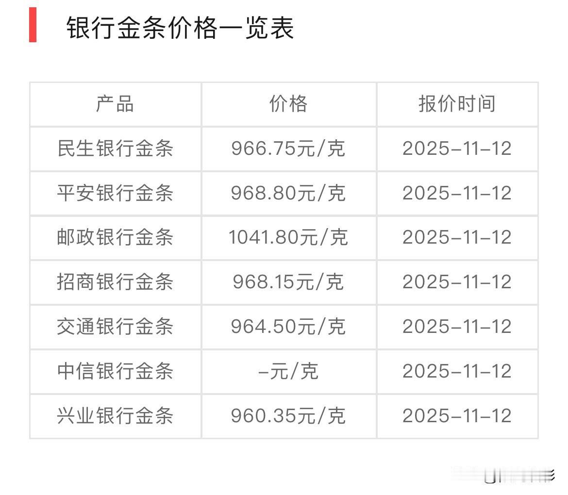 最新金条价格出炉 各大金条价格出炉, 如下: 工商银行金条每克964.60元。 建设银行金条每克965.00元。 农业银行金条每克976.85元。 还有民生银行、平安银行、邮政银行、招商银行、交通银行、兴业银行最新金条价格信息。 需要购买的,可以参考一下。 以上所有信息,仅供参考! 还是那句话,理财有风险,投资需要谨慎! 金条行情 银行金条 银行金条价 黄金一克小金条 金条避坑 金条市场 铂金投资金条 珠宝金条