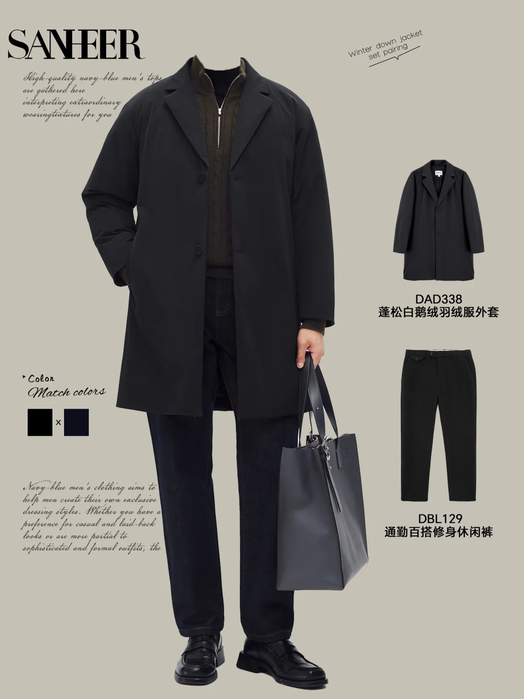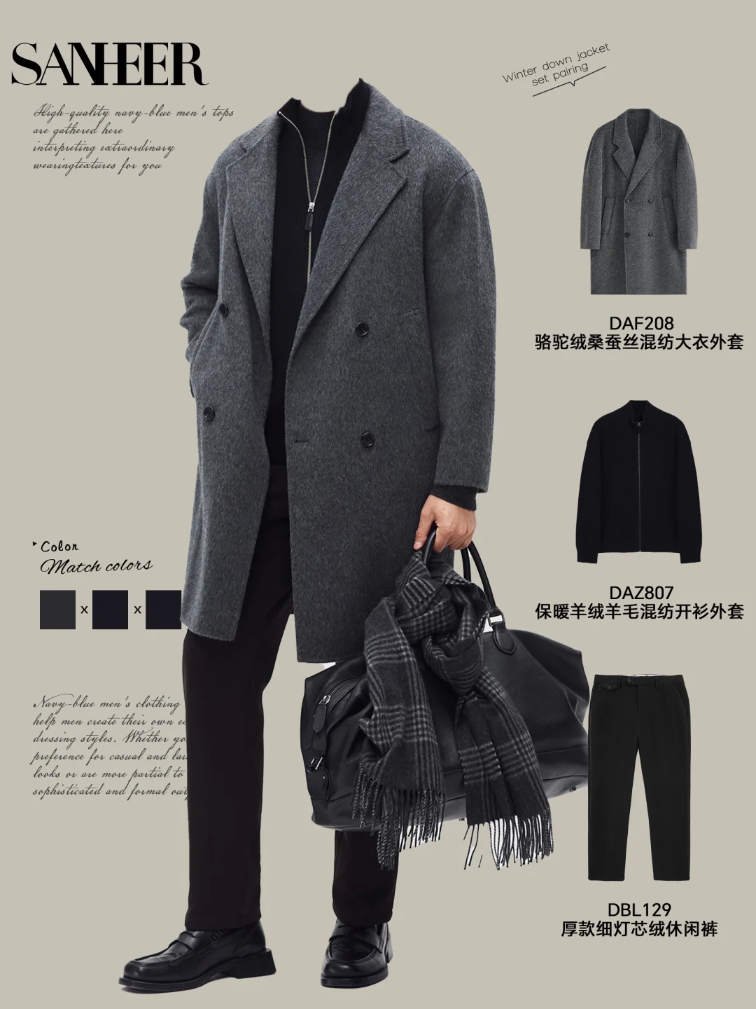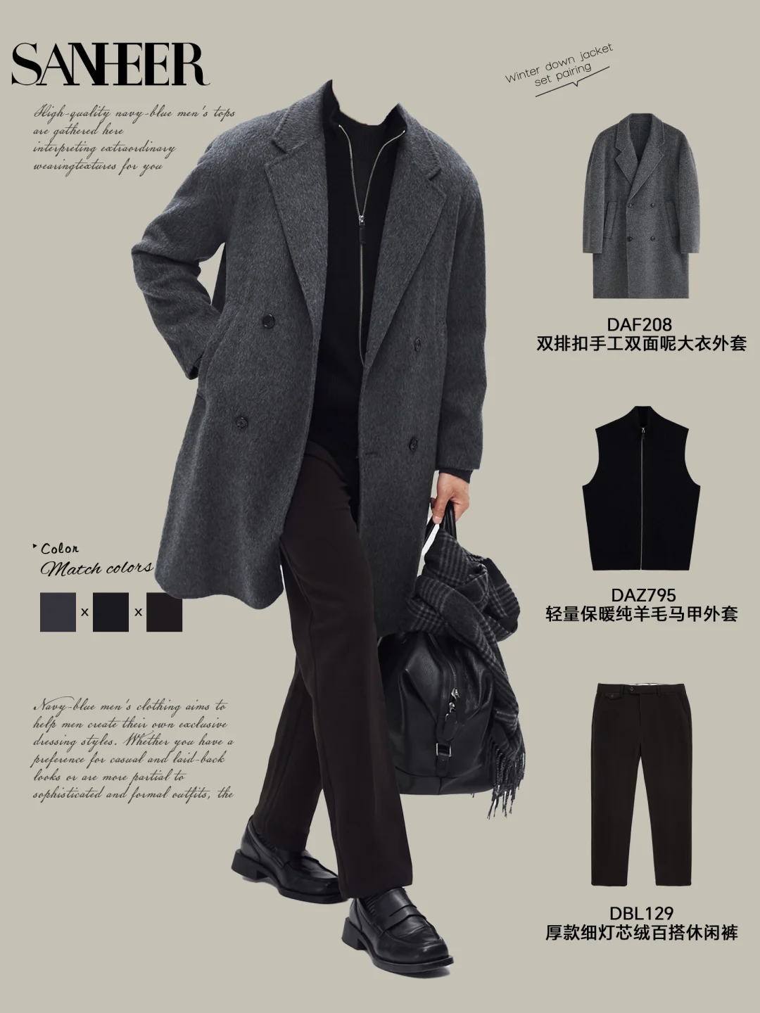 黑色厚外套+白衬衫+灰色西裤+德比鞋