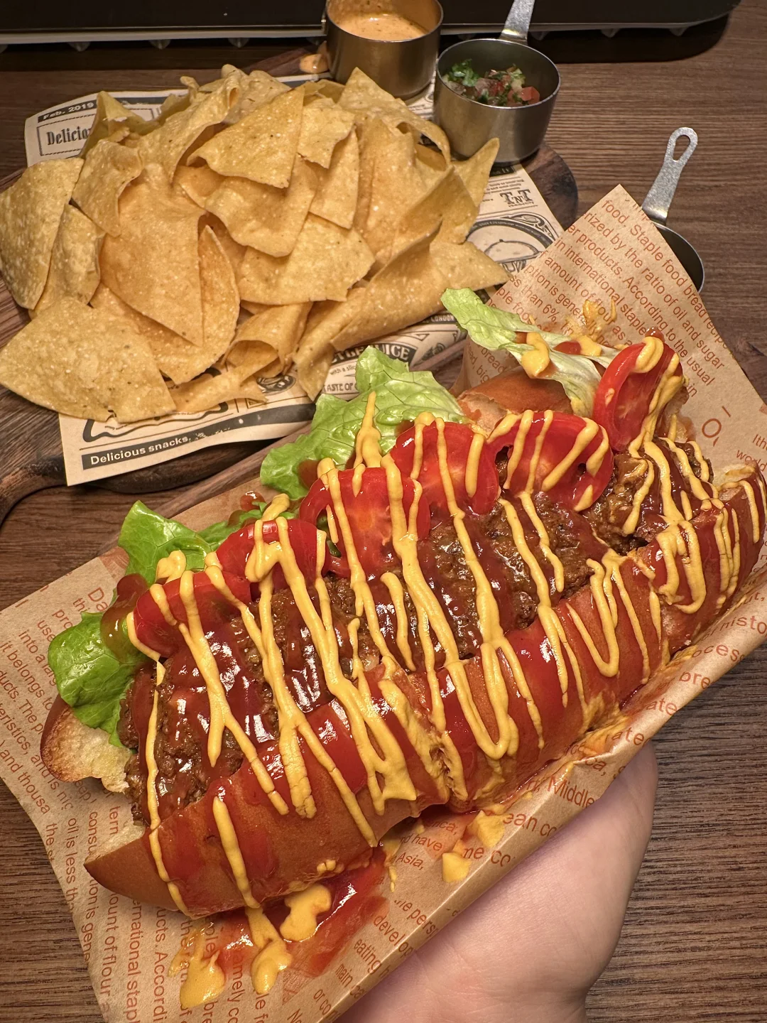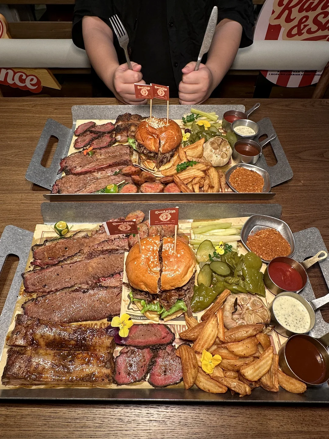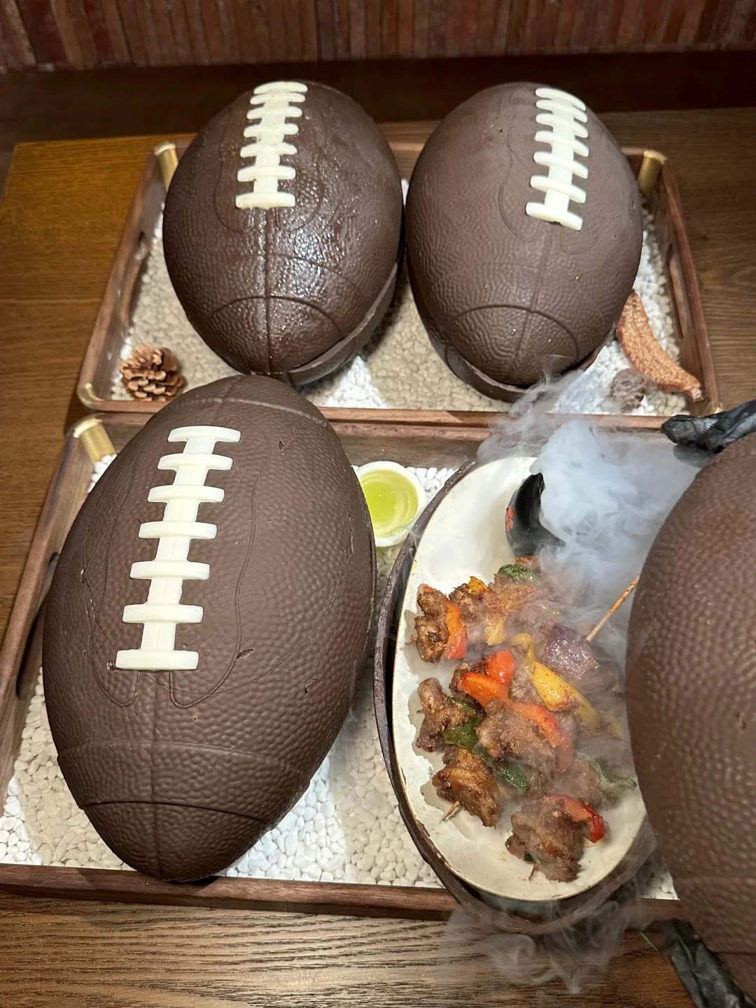 深圳已经进化到这种程度了吗…K11这家店橄榄球竟然就这样被端上桌了😅其实里面是肉串来的。。 明窗现烟熏的各类拼盘、热狗,果木香很浓~ 环境和氛围也很到位,很适合约会拍照📸