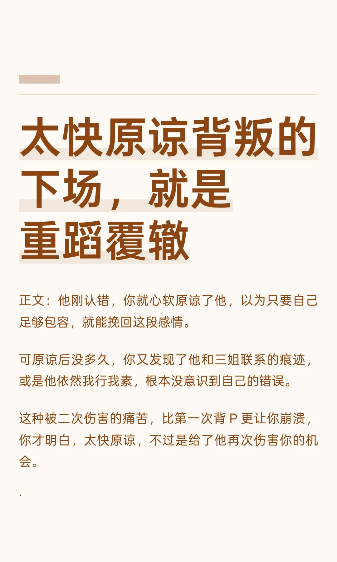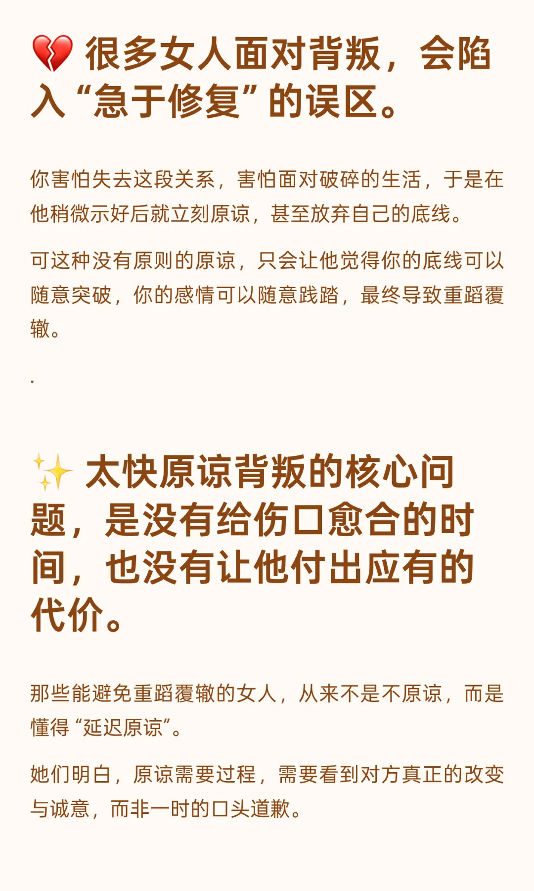 💔 很多女人面对背叛,会陷入 “急于修复” 的误区。你害怕失去这段关系,害怕面对破碎的生活,于是在他稍微示好后就立刻原谅,甚至放弃自己的底线。可这种没有原则的原谅,只会让他觉得你的底线可以随意突破,你的感情可以随意践踏,最终导致重蹈覆辙。