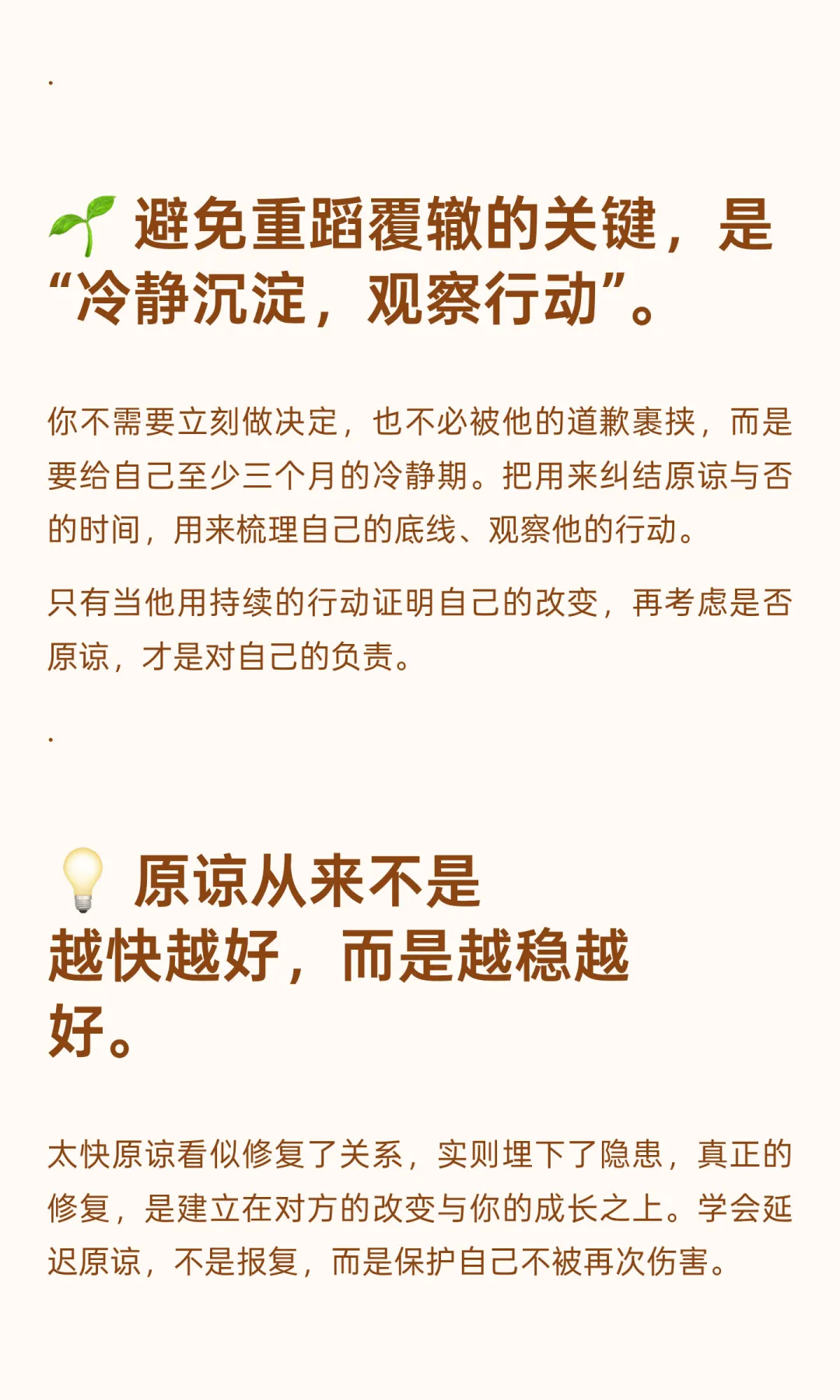 🌱 避免重蹈覆辙的关键,是 “冷静沉淀,观察行动”。你不需要立刻做决定,也不必被他的道歉裹挟,而是要给自己至少三个月的冷静期。把用来纠结原谅与否的时间,用来梳理自己的底线、观察他的行动。只有当他用持续的行动证明自己的改变,再考虑是否原谅,才是对自己的负责。