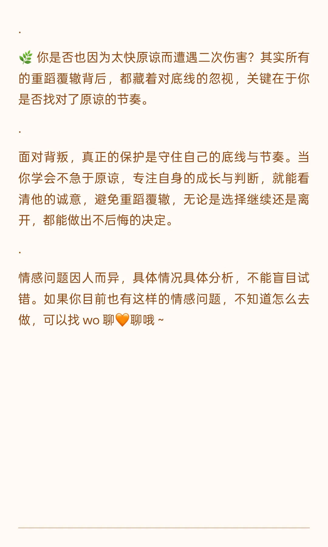 🌿 你是否也因为太快原谅而遭遇二次伤害?其实所有的重蹈覆辙背后,都藏着对底线的忽视,关键在于你是否找对了原谅的节奏。