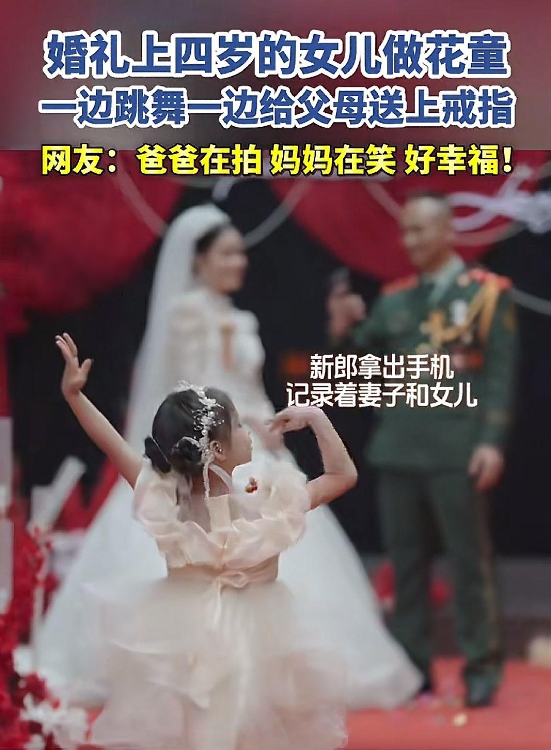 婚礼上四岁的女儿做花童,一边跳舞一边给父母送上戒指。 网友: 爸爸在拍,妈妈在笑
