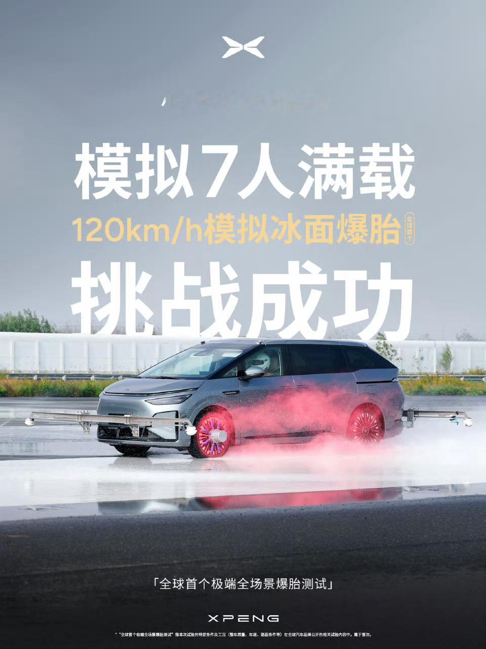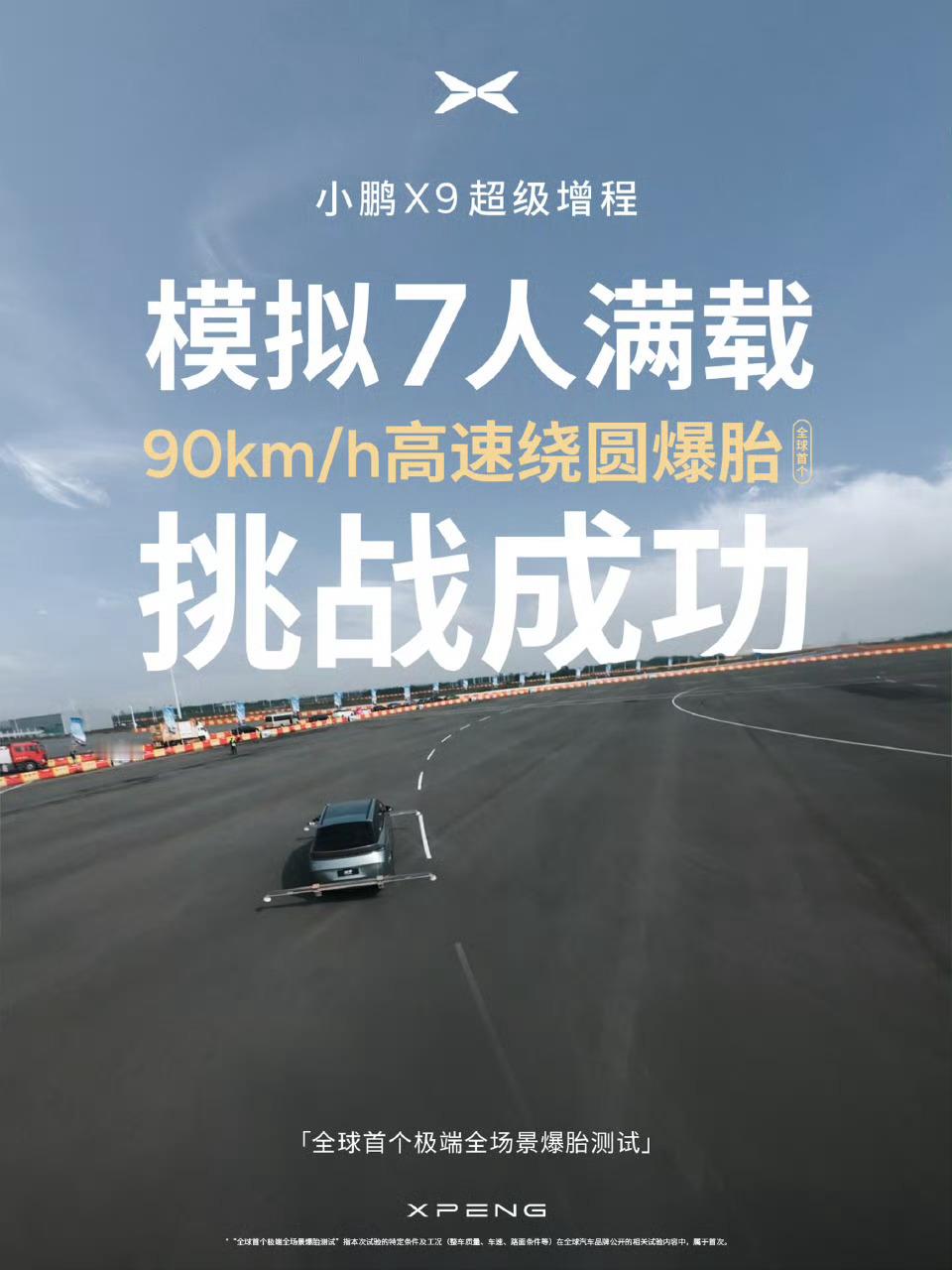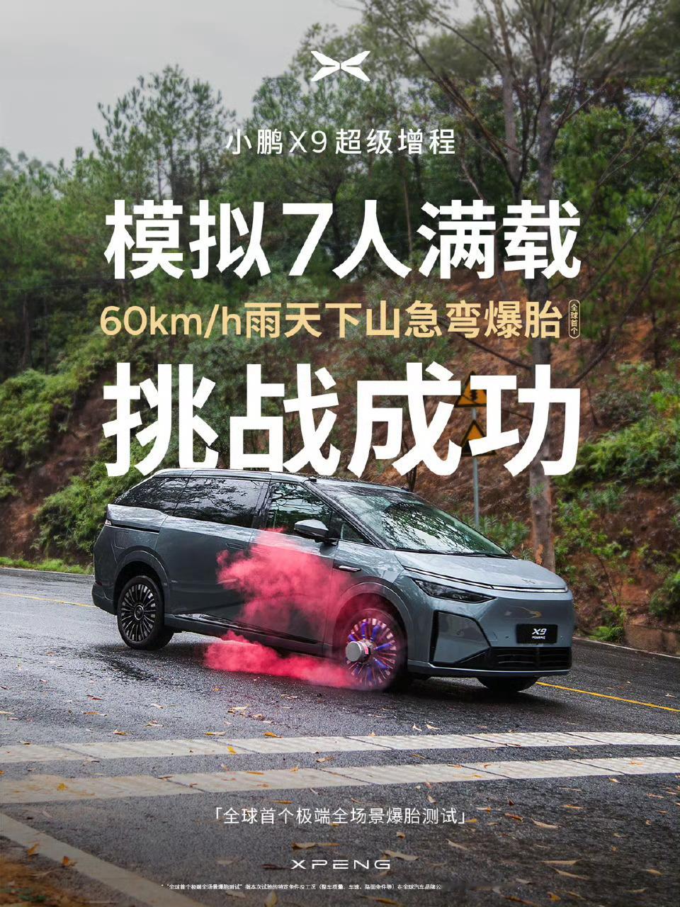 前几天的小鹏X9超级增程极端全场景爆胎测试成绩来了:5大场景+6大极限工况+7人满载全车总重达3.324吨,爆胎测试全通关!160km/h 积水路面爆胎 挑战成功150km/h 暴雨天气爆胎 挑战成功150km/h 同侧双轮爆胎 挑战成功120km/h 模拟冰面爆胎 挑战成功90km/h 高速绕圆爆胎 挑战成功60km/h 雨天下山急弯爆胎 挑战成功稳得住,刹的停,小鹏X9用实测成绩证明