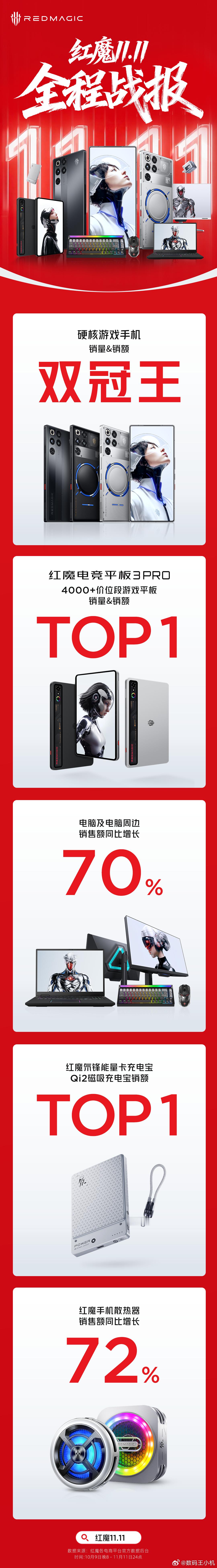 红魔官方发布双十一战报,不仅是红魔11 Pro系列拿下了硬核游戏手机的双冠王,红魔电竞平板3Pro也夺得了4000+价位段游戏平板的TOP1。同时红魔电竞宇宙也迎来了大卖,电脑及电脑周边销售额同比增长70%,充电宝拿下Qi2磁吸充电宝销额第一,散热器销额也大涨72%。从全球第一的电竞手机到全球领先的电竞装备品牌,红魔未来可期!