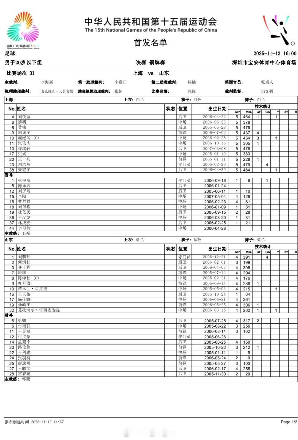 山东U20 VS 上海U20 ,首发阵容。