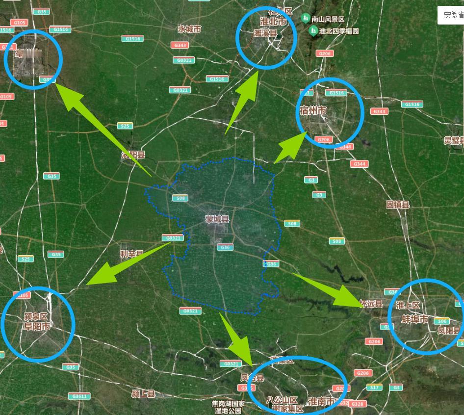 蒙城,绕城高速! 蒙城的地理位置,在皖北,基本上处于皖北5个城市的中心位置,但是以前的交通却比较落后,这几年才算跟上。 由宿遂高速,宁洛高速,德上高速,五亳高速,四条高速形成的包围圈,仅仅围绕蒙城整个县城。 分布了5个高速出入口。这个区位,配得上这个交通建设。 而且皖北城际铁路的枢纽,预计明年高铁建成通车。