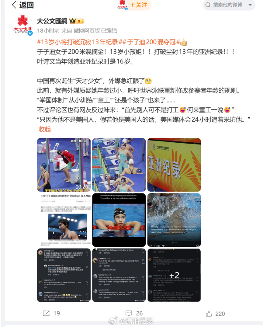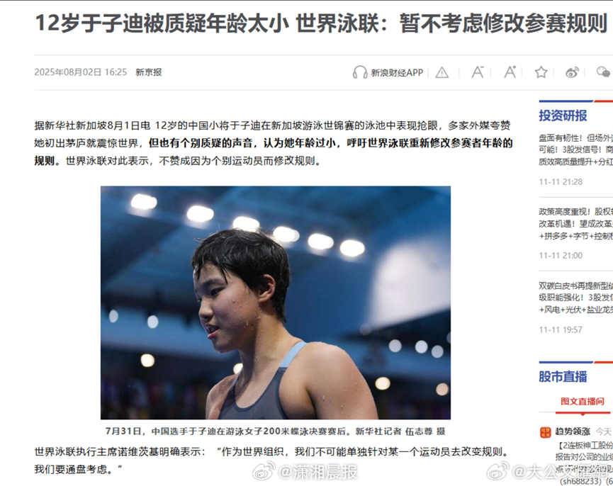 【,】11月11日,第十五届全运会泳池见证了一个历史性的时刻。13岁的“小孩姐”于子迪在女子200米个人混合泳决赛中,以2分07秒41的惊人成绩强势夺金。她一举打破由叶诗文在2012年伦敦奥运会上创造、尘封13年的亚洲纪录,叶诗文当年16岁。纪录存在的意义正是被打破,中国游泳江山代有才人出的传承,在这一刻得到了最激动人心的诠释。然而,面对来自东方的青春风暴,并不是所有人都感到高兴。此前,外媒对于子迪的报道,就混杂着怀疑、酸涩乃至“破防”的声音。数月前的新加坡世锦赛,12岁的于子迪初登世界级舞台,便在强手如林的200混决赛中游出2分09秒21,距领奖台仅咫尺之遥。数据不会撒谎——她0.67秒的迅捷出发,以及在自由泳末端上演的“叶诗文式”强力反超,都彰显出卓越的天赋及战术素养。最终,她与铜牌只差半个手掌的距离。美媒《SwimSwam》主笔曾以长文指控她“绝对不可能”12岁游出此等成绩;当她的成绩在两个月内提升1.42秒时,他们又惊呼这是美国从未有过的“奇迹”。这背后,是一种根深蒂固的双重标准——对某些人来说,当天才出现在自家阵营,便是“英雄出少年”;当奇迹诞生于他国,便成了需要审查的“可疑对象”。外媒的一些论调,在事实面前显得苍白无力。于子迪5月在全国冠军赛游出的2分10秒63,已比美国12岁女子纪录快了整整8秒,甚至超越了美国同年龄段的男子纪录。她的200米蝶泳成绩,更是直接碾压了美国13-14岁组的全国纪录(2分15秒71)。当“别人家的孩子”不仅超越了你的女子纪录,甚至比你同年龄的男孩游得还快时,那种基于长期认知建立的国家优越感及人种优越感便成了笑话,“破防”只能是掩耳盗铃维持所谓自尊的最后盾牌。我们都知道,于子迪的崛起,绝非某些外媒臆想的那些非正常路径。恰恰相反,这是中国体育科学化、人性化训练体系结出的硕果,是新一代运动员营养富足、训练方法得当的明证。在此前外媒报道的评论区,网友的反驳可谓一针见血:“首先别人可不是打工,何来童工一说?” “只因为她不是美国人,假若她是美国人的话,美国媒体会24小时追着采访她。”泳坛的于子迪、潘展乐,到网球的郑钦文等等,他们在不同的赛场上,用卓越的表现挑战外国传统优势项目,向世界宣告着中国新生代运动员的力量。未来,我们还一定会有更多年轻天才,在各个项目上崭露头角,这是中国体育厚积薄发的必然结果。于子迪的全运会征程才刚刚开始,她一人报名十项,预示着中国游泳一个充满无限可能的未来。我们应当记下这个名字,并相信,随着更多像她一样的年轻才俊崭露头角,外媒以后还有的是破防的时候。而我们要做的,就是继续支持我们的运动员,让成绩成为回应一切无端质疑的最强音。文章为潇湘晨报主编有态度原创出品