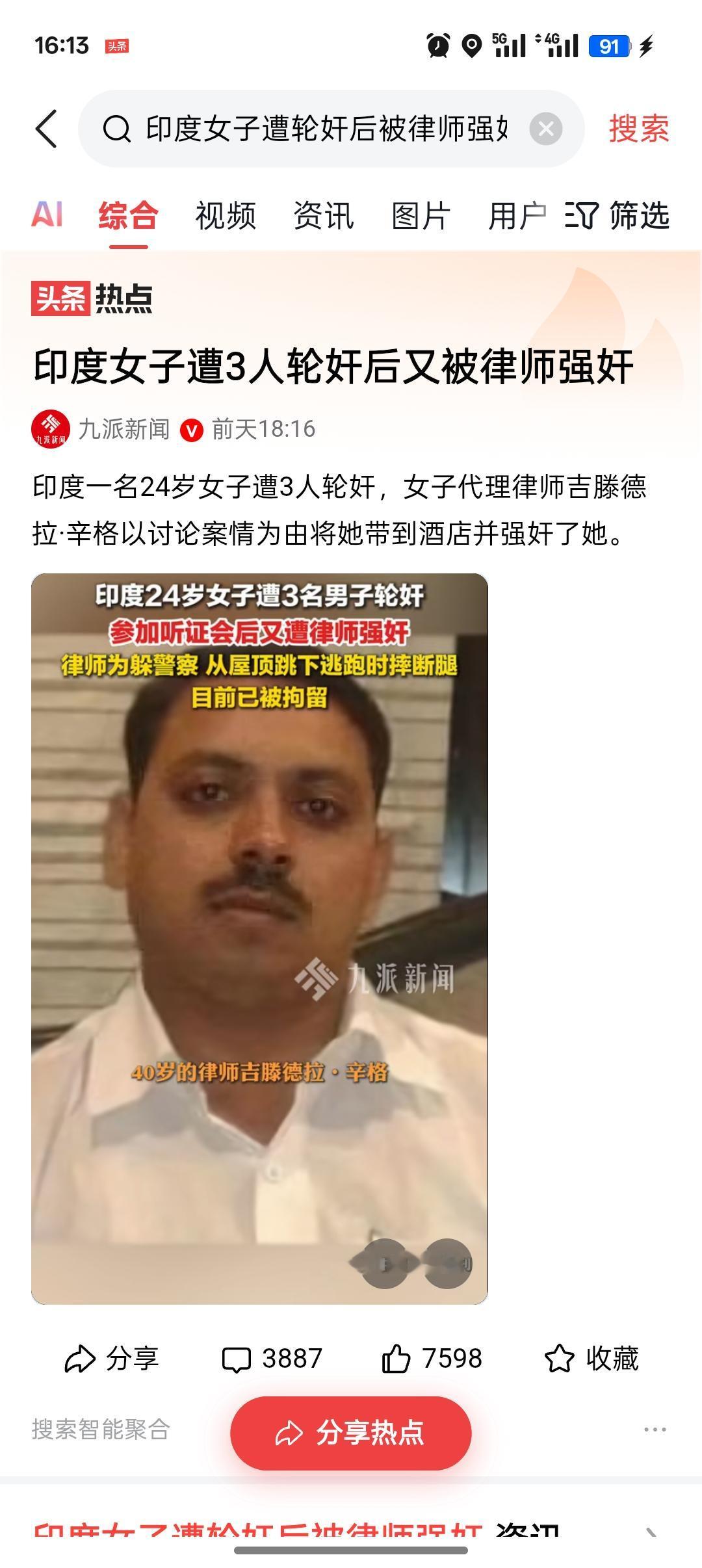 印度一女子被轮奸官司三年无果,正准备和解的时候遭遇被告律师再强奸。律师在追捕过程中律师试图逃跑跳下房顶,导致骨折。网友:这件事真的很印度~ 事情的经过是这样的,在2022年的时候一名24岁印度女子被人轮流侵犯后,一纸诉状将这伙人告上法庭。这起案件持续时间挺长,11月6日,在案件审理过程中,一名被告的律师40岁的吉滕德拉联系到她,说事已至此不如讨论下庭外和解的事情。 受害女子想想也是那么回事,就和他见面了,刚见面的时候还觉得这名律师浓眉大眼看起来还挺好个人。而且律师还给她定了房间,说时间太晚了回家不安全。 结果,律师离开酒店后又带着晚餐回来了,他把门给反锁后就对受害女子进行了侵犯,还阻止她离开房间。 咱就说,这可真是烂到根儿了,正常人谁能想到本来应该伸张正义的律师、印度的体面人,会做出这样不体面的事呢?而且这名律师估计还深谙心理学,他抓住了参加听证会的受害女子孤立无援、各种委屈的情绪,就抛出了“庭外和解”的橄榄枝。毕竟这件事拖得太久了,受害女子也想着能和解就和解吧,要不然这件事也容易烂尾。 结果她就遭遇了这样的事情,这哪是寻求正义,分明是踏入另一重深渊。本应守护公平的律师,却成了二次伤害的施暴者,跳房骨折不过是罪有应得的狼狈。 三年官司无果已是司法之耻,如今雪上加霜,“很印度”的调侃背后,藏着多少女性的绝望与这片土地难以根治的溃烂。