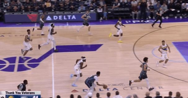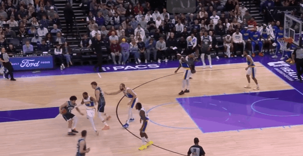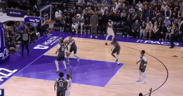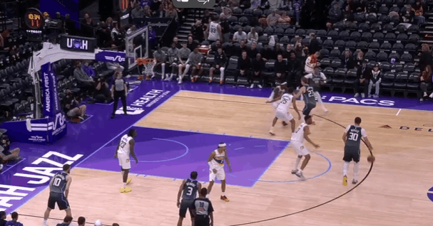 爵士观察:埃斯·贝利对阵步行者20分回顾,生涯目前最佳表现贝利在季前赛时展现出过不错的表现,尤其是对阵火箭的25+6和对阵马刺的20+7。但到了强度更高的常规赛,贝利并没能延续季前赛的状态,陷入了低迷。本场之前贝利场均只有6分,命中率是可怜的35%,因此也没有获得充足的上场时间(不足20分钟)来“练级”。今天爵士在对阵步行者的比赛中轰出了152分的高分,贝利也打出了他生涯迄今为止表现最好的一场比赛:投篮13中7,三分8中4,拿到20分4篮板。今天就来观察一下他的表现。图1乔治与弩机LOGO位置的超高位挡拆,“拒绝掩护”突破篮下吸引西卡大范围回收协防。弱侧的内史密斯没有注意到要兼顾一防二,贝利直接执行“Back Cut”接球扣篮,惩罚了西卡的放空。图2第一波进攻没出机会后,贝利弱侧接球发起第二波进攻:接球后佯装交叉步启动左路突破,实则衔接炸球横撤步持球三分,命中。图3强弱侧同时跑动:强侧弩机、乔治、米哈三人的“ZOOM Action”配合,与此同时弱侧的贝利为马卡设置“Pin Down”。米哈三分不中,贝利高高跃起拼抢前场篮板。值得一提的是贝利目前展现出了不俗的前板掠夺活力,本场前每36分钟能抢到3.5个前场篮板。本场比赛也抢到了3个。图4克莱顿和马卡高位挡拆,贝利抓西卡和厄尔沟通换防的间隙获得出手空间,接球后迅速出手三分进行惩罚。图5转换进攻炸球急停后背运衔接后撤步,出手持球三分命中。图6换防到弧顶的TJ因此也天然拥有了快攻身位优势,TJ退防过程中被持球推进的菲利吸引,没有及时兼顾快下的贝利。贝利接到队友上球后直接扣篮得手。图7借助“Pin Down”上提后迅速借助马卡翻转后的第二次掩护衔接右路突破,刺探急停+变向拉回后再衔接撤步出手持球三分。图8贝利持球策动的“Horns Chest”,西卡换防后被弩机的无球掩护延阻,贝利迅速给空手切至远端的马卡上球。